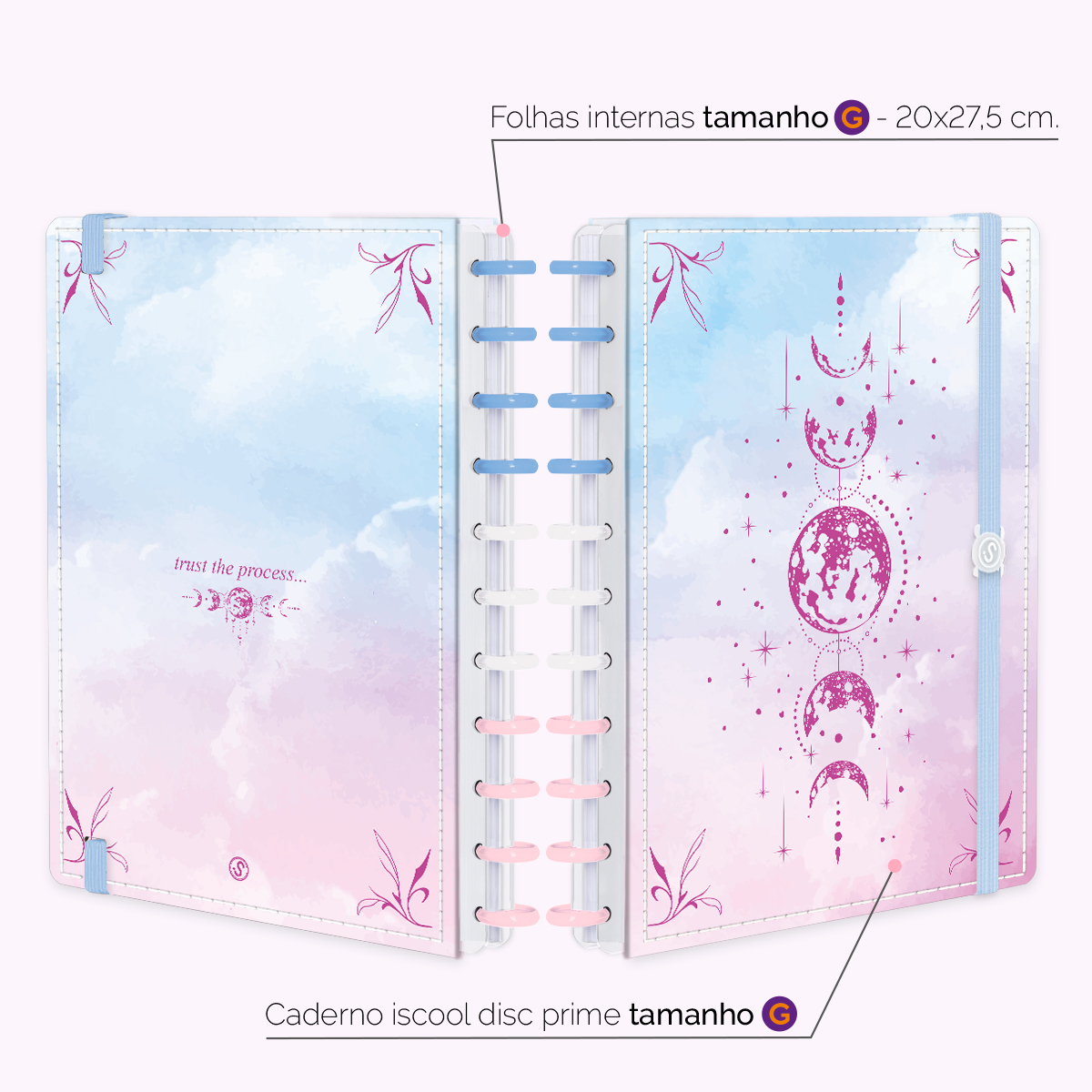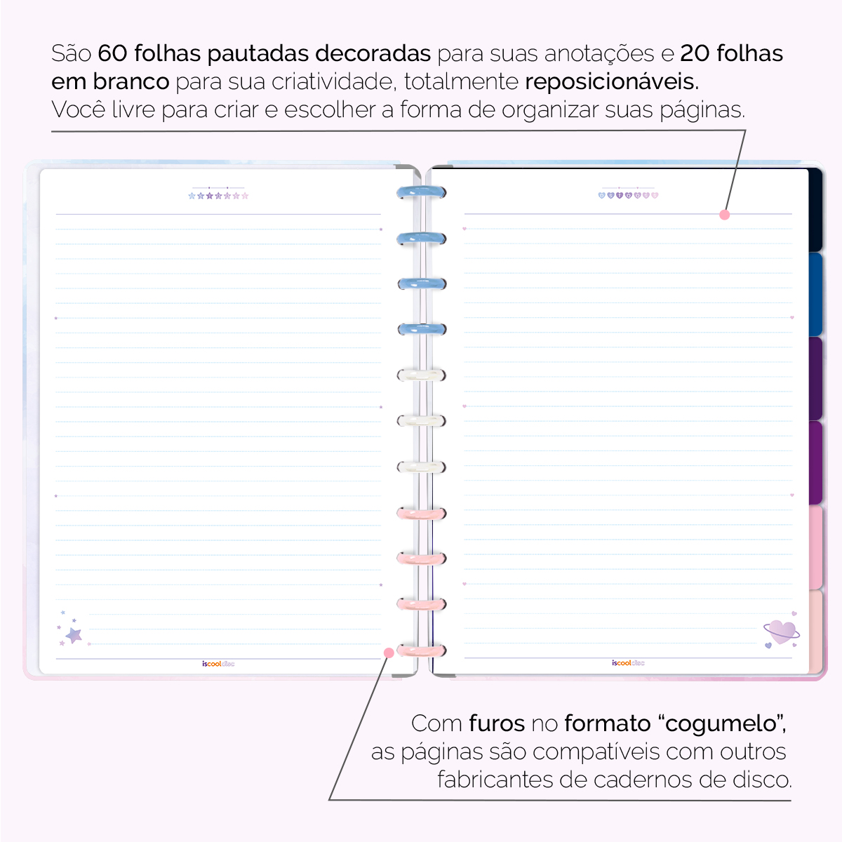Além de tudo isso, o ISCOOL DISC PRIME UNIVERSITÁRIO, conta com detalhezinhos que fazem toda diferença: elástico para fechamento da capa, muito mais estilo e privacidade para suas anotações; bolsa plástica para guardar seus rascunhos, referências, lembretes, documentos e uma cartela de adesivos incríveis, para que você possa personalizar seu caderno do seu jeitinho!