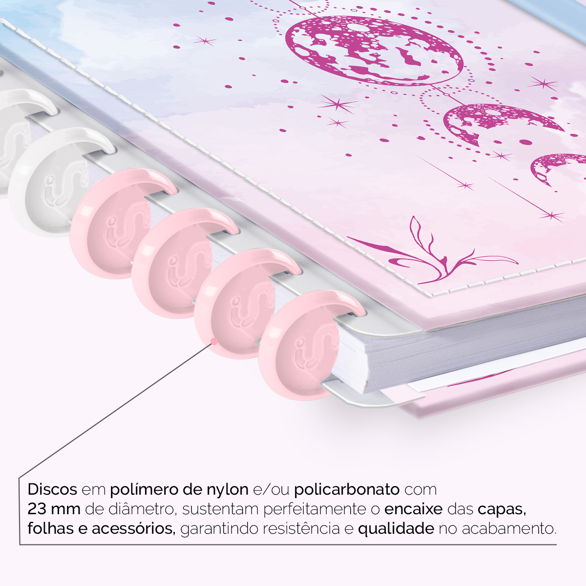 Encadernado com 11 discos G de 32mm em polímero de nylon e/ou policarbonato coloridos, fabricados no Brasil.