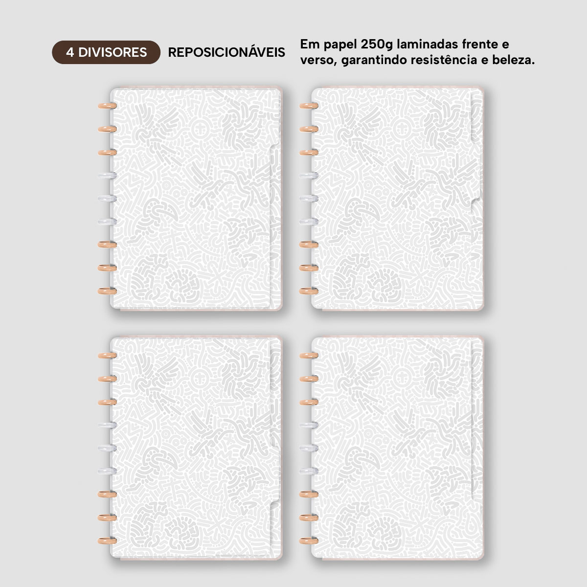 A capa é dura, com impressão digital de alta definição, e acompanha 6 lindas divisórias que você pode colocar em qualquer local do caderno, funcionando como o guia perfeito para sua organização.
