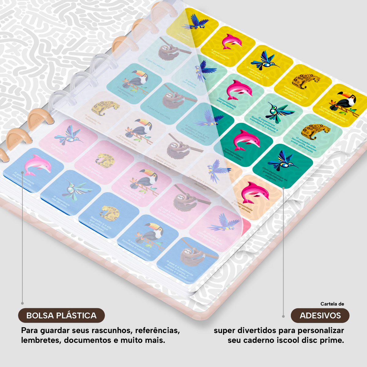 Além de tudo isso, o Iscool Disc Prime conta com detalhes que fazem toda a diferença: elástico para fechamento da capa, muito mais estilo e privacidade para suas anotações; bolsa plástica para guardar seus rascunhos, referências, lembretes, documentos e duas cartelas de adesivos incríveis, para que você possa personalizar seu caderno do seu jeitinho!
