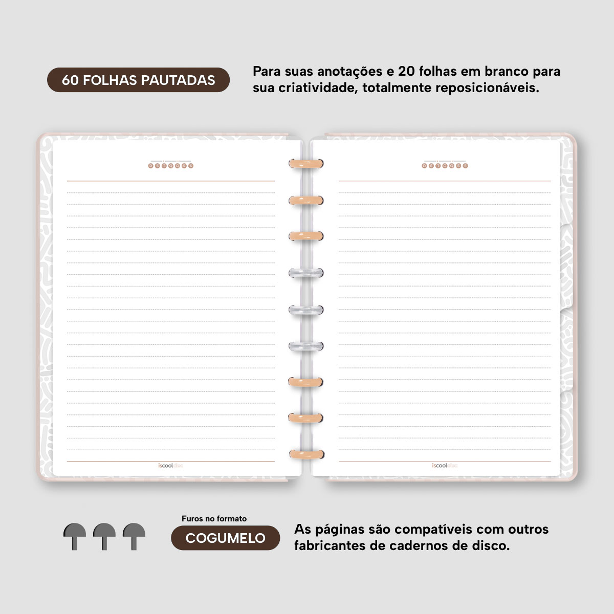 O miolo conta com 60 folhas pautadas decoradas em papel sulfite 90g (aquele papel mais “grossinho”) para que você use e abuse das suas canetas especiais, e 20 folhas em branco, ideais para explorar seu lado mais criativo ou até imprimir nelas.