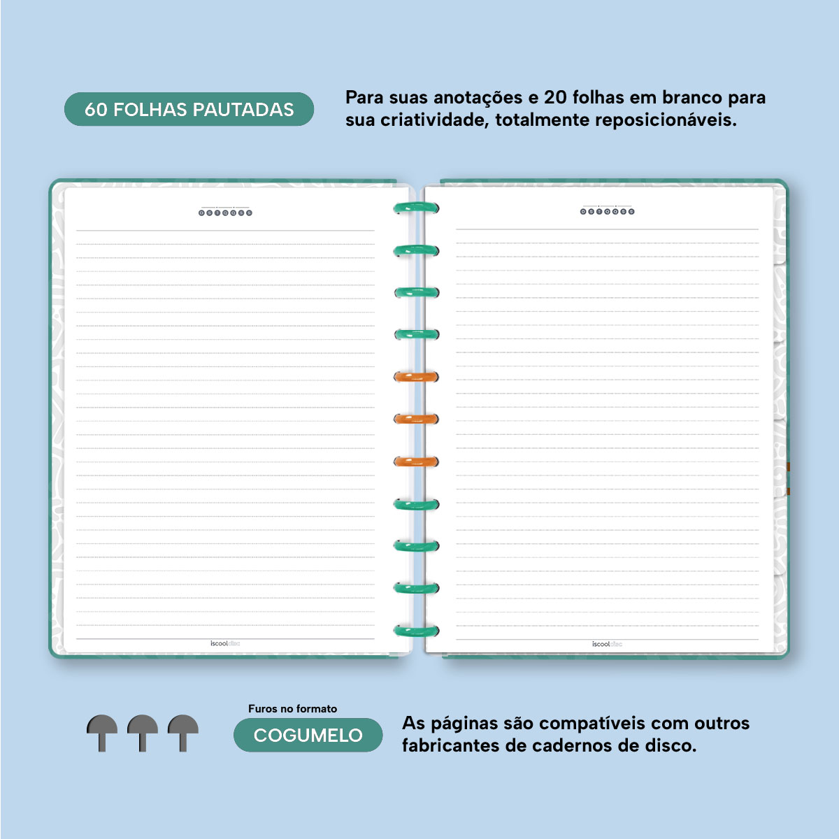 Com furos no formato de “cogumelo”, você poderá dar um “up” em seu caderno com nossos refis, além de ser compatível com outros fabricantes de cadernos de discos.