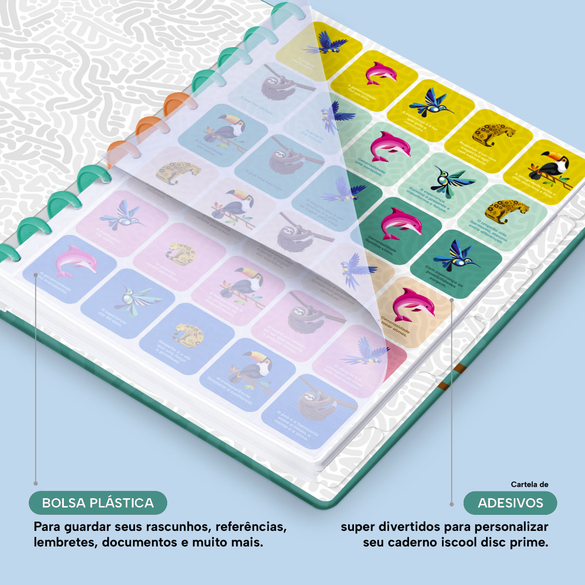 Além de tudo isso, o Iscool Disc Prime conta com detalhes que fazem toda a diferença: elástico para fechamento da capa, muito mais estilo e privacidade para suas anotações; bolsa plástica para guardar seus rascunhos, referências, lembretes, documentos e duas cartelas de adesivos incríveis, para que você possa personalizar seu caderno do seu jeitinho!