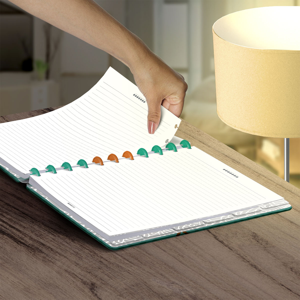 Encadernado com 8, 9 ou 11 discos M de 23mm em polímero de nylon e/ou policarbonato coloridos, fabricados no Brasil.