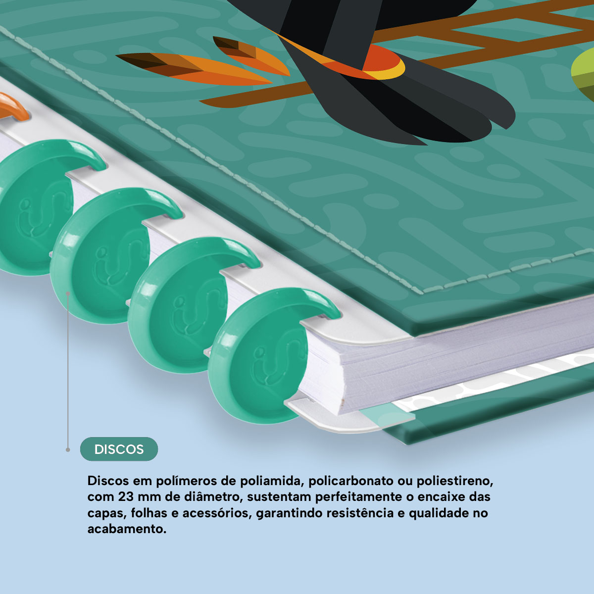 Os nossos discos são fabricados em polímero de nylon e/ou policarbonato. Podem ser substituídos, proporcionando imensa variedade na combinação das cores, qualidade no acabamento e eficácia no encaixe das capas, folhas e acessórios.