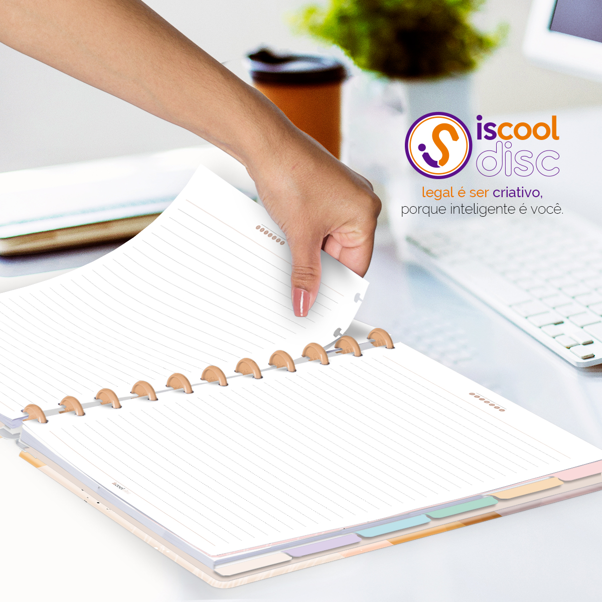 Com furos no formato de “cogumelo”, você poderá dar um “up” em seu caderno com nossos refis, além de ser compatível com outros fabricantes de cadernos de discos.