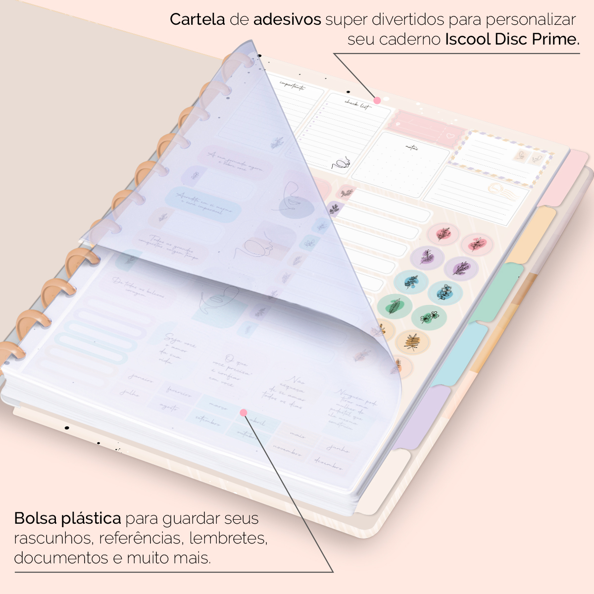 Além de tudo isso, o ISCOOL DISC PRIME UNIVERSITÁRIO, conta com detalhezinhos que fazem toda diferença: elástico para fechamento da capa, muito mais estilo e privacidade para suas anotações; bolsa plástica para guardar seus rascunhos, referências, lembretes, documentos e uma cartela de adesivos incríveis, para que você possa personalizar seu caderno do seu jeitinho!