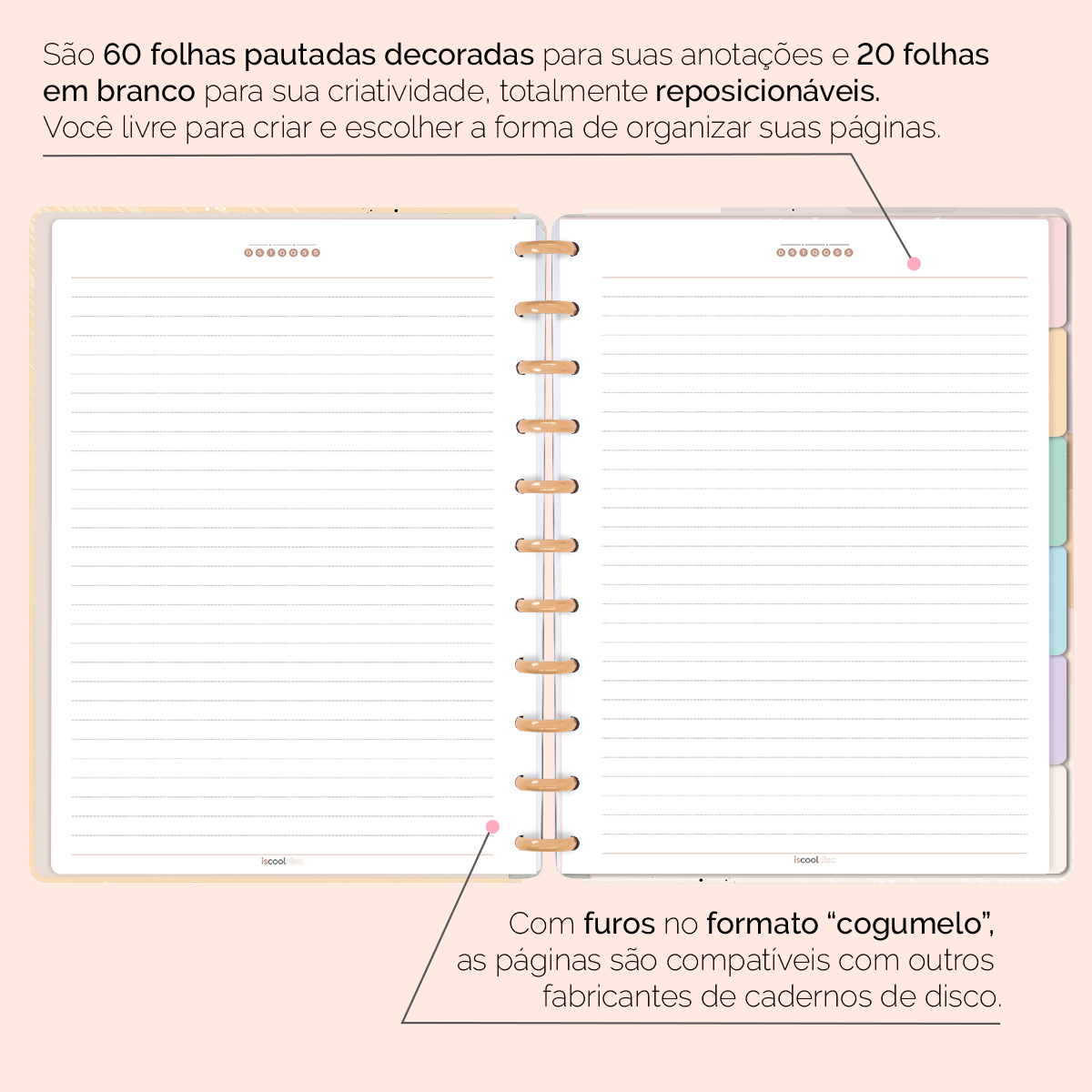 O miolo conta com 120 folhas pautadas decoradas em papel sulfite 90g, (aquele papel mais “grossinho”) para que você use e abuse das suas canetas especiais e 20 folhas em branco, ideais para explorar seu lado mais criativo ou até imprimir nelas.