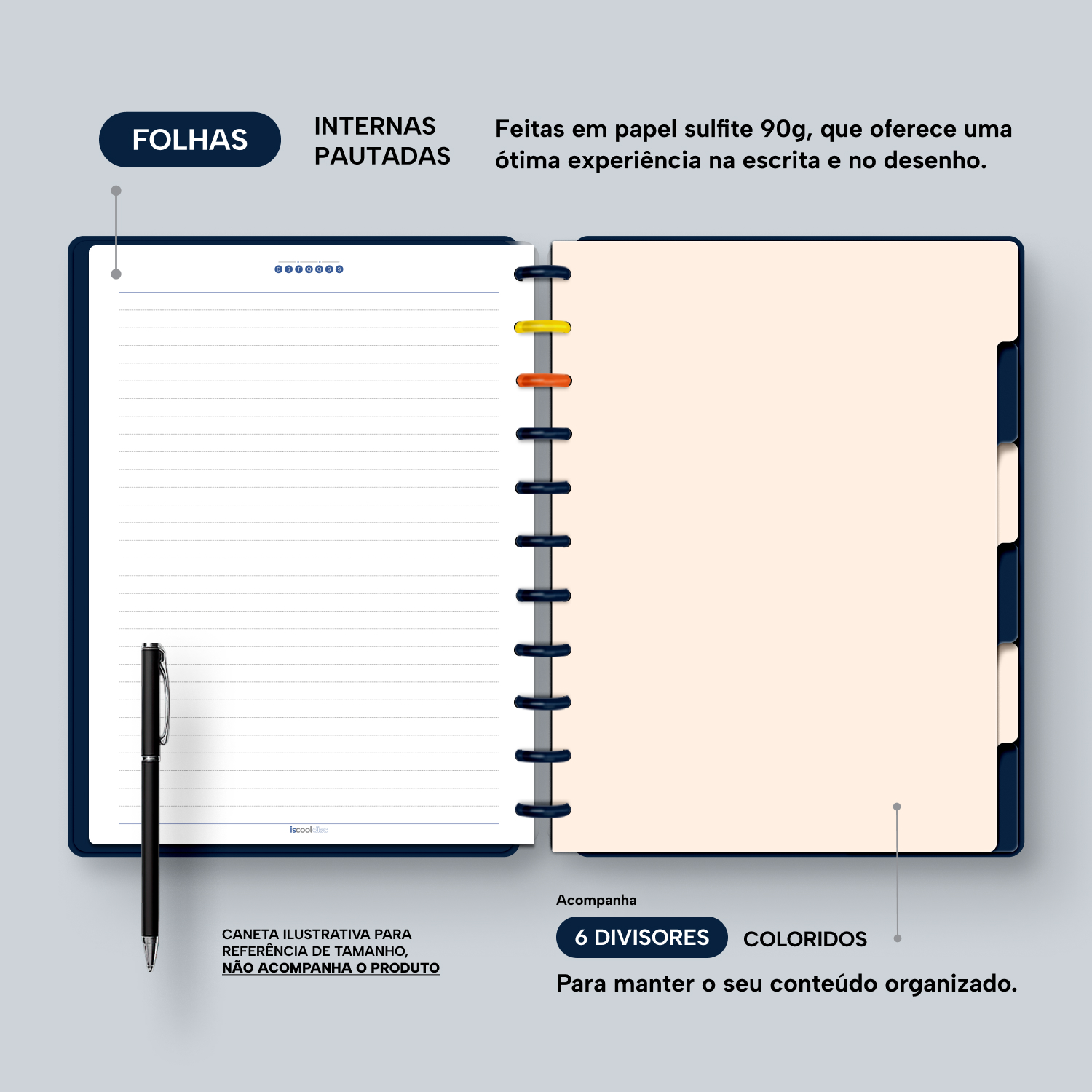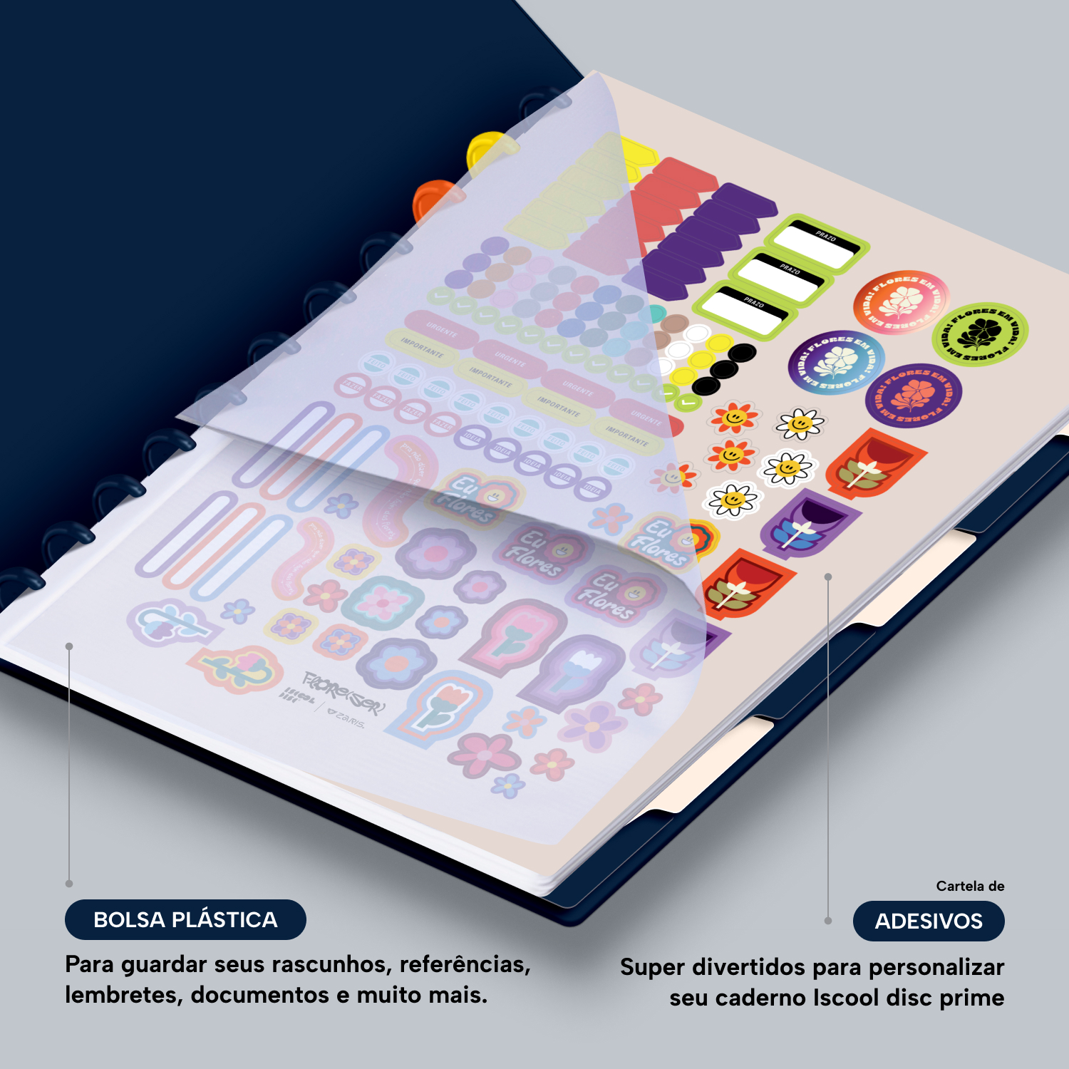 Além de tudo isso, o iscooldisc Prime conta com detalhes que fazem toda a diferença: elástico para fechamento da capa, muito mais estilo e privacidade para suas anotações; bolsa plástica para guardar seus rascunhos, referências, lembretes, documentos e uma cartela de adesivos incríveis, para que você possa personalizar seu caderno do seu jeitinho!