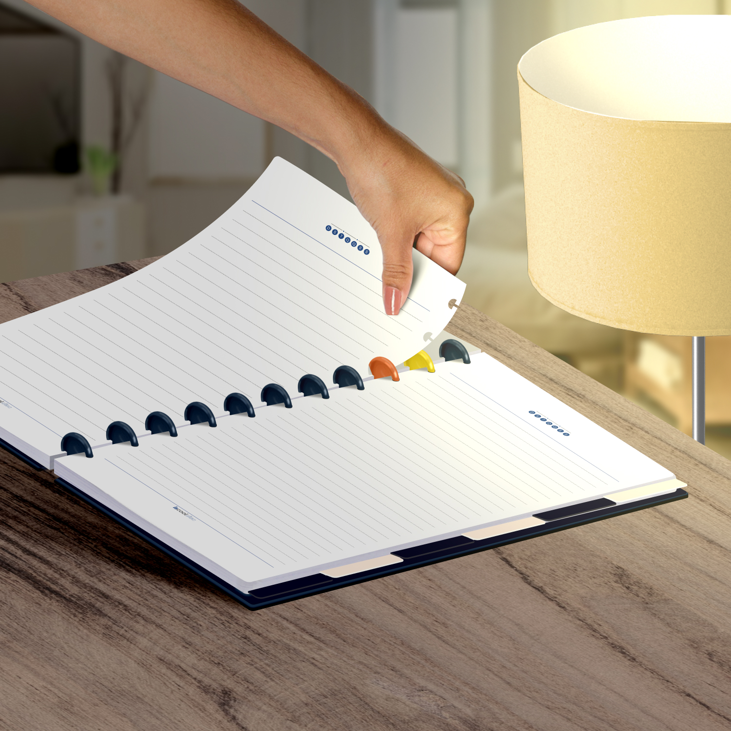 Encadernado com 11 discos M de 23mm em polímero de nylon e/ou policarbonato coloridos, fabricados no Brasil.