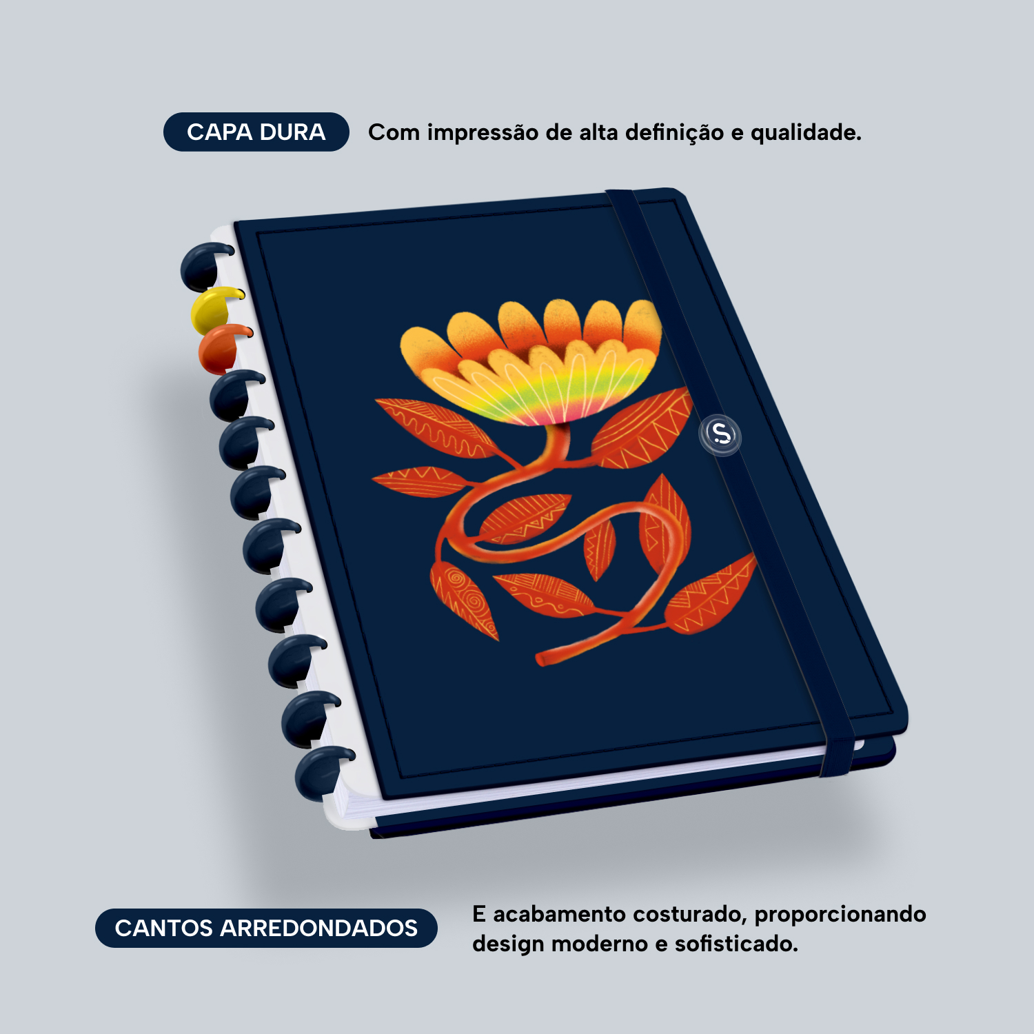 A capa é dura, com impressão digital de alta definição, e acompanha 6 lindas divisórias que você pode colocar em qualquer local do caderno, funcionando como o guia perfeito para sua organização.