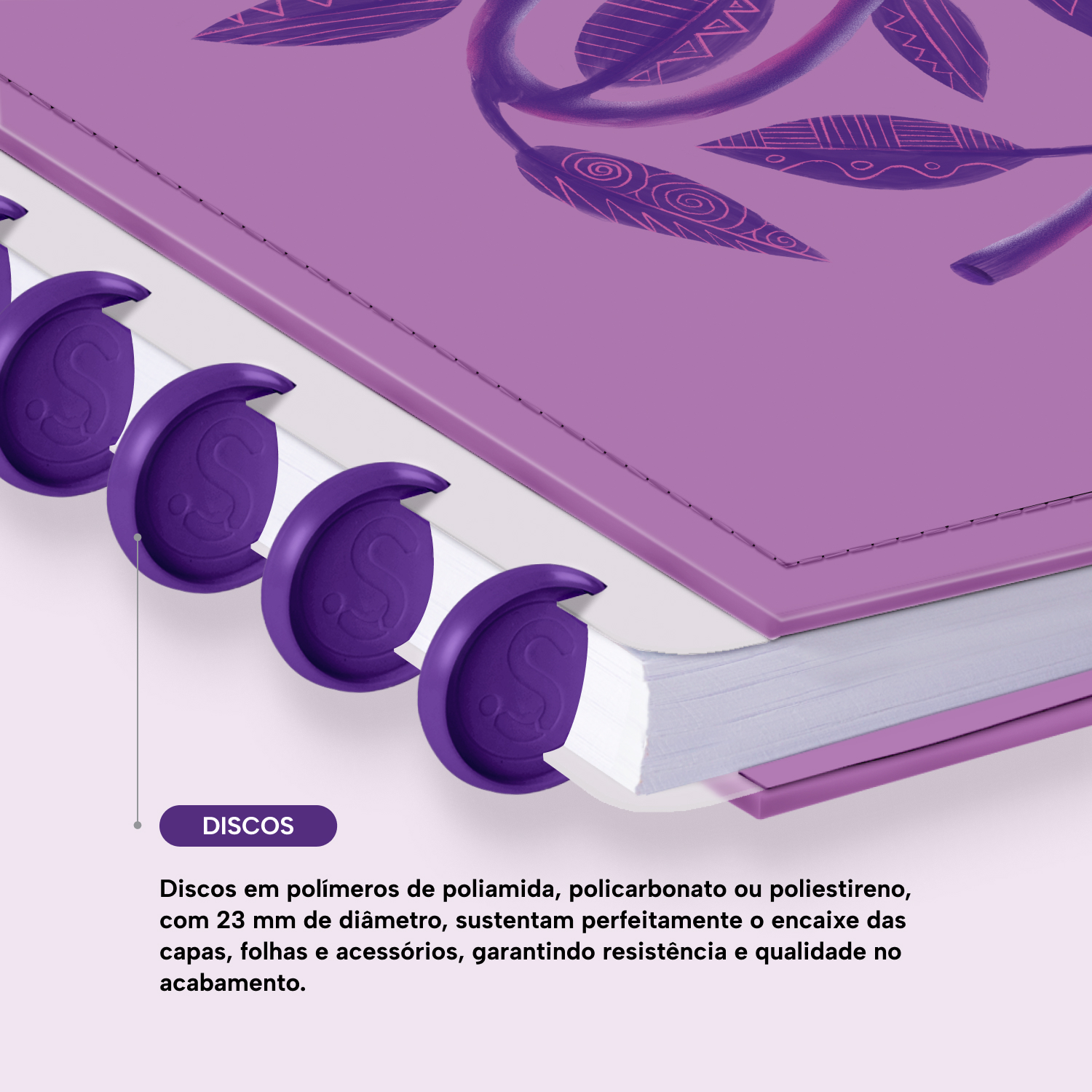 Encadernado com 11 discos M de 23mm em polímero de nylon e/ou policarbonato coloridos, fabricados no Brasil.