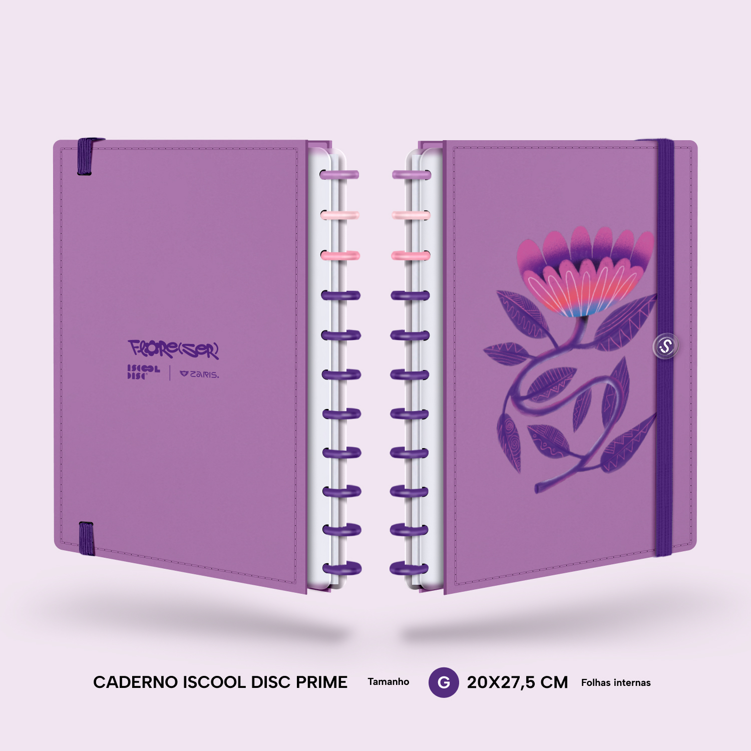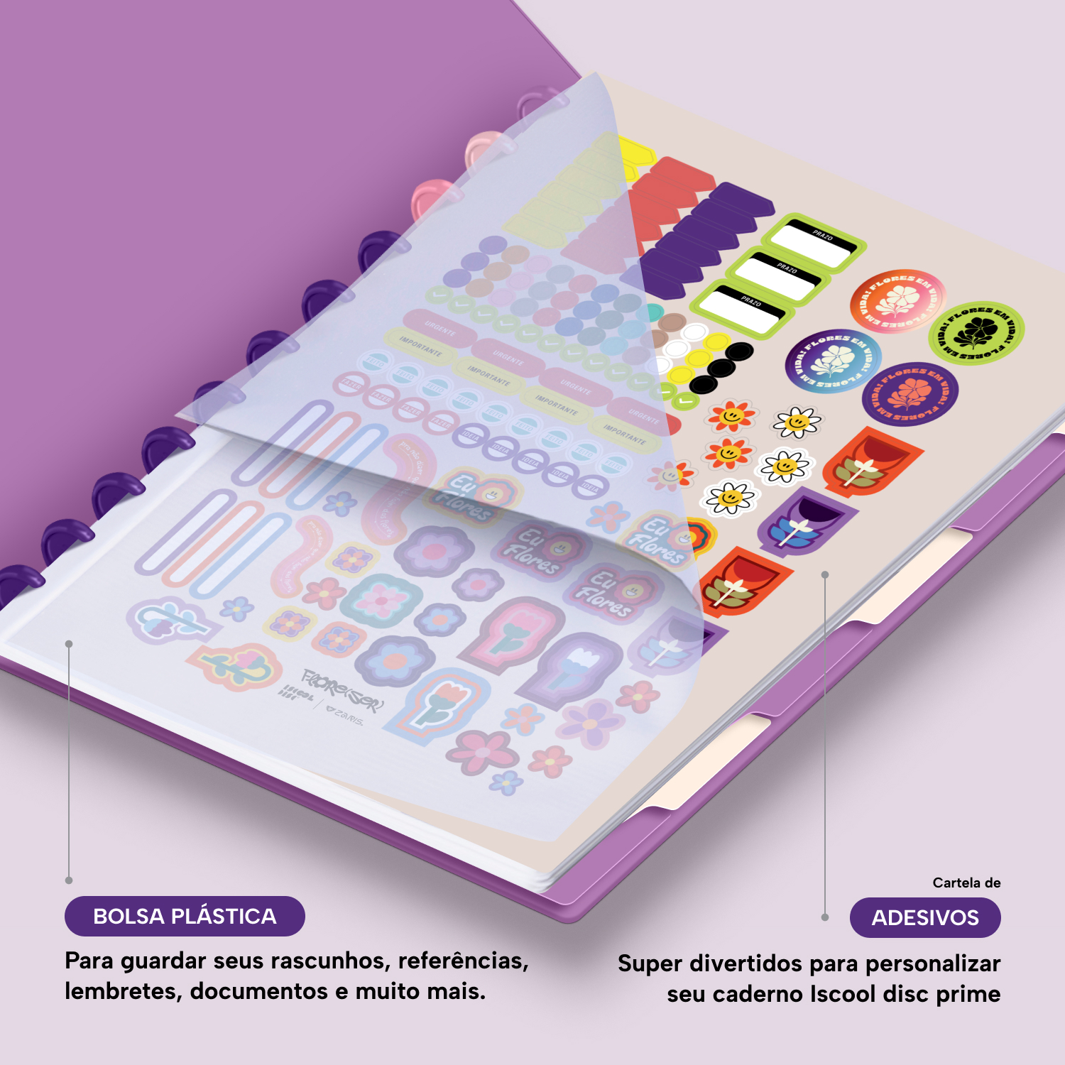 Além de tudo isso, o iscooldisc Prime conta com detalhes que fazem toda a diferença: elástico para fechamento da capa, muito mais estilo e privacidade para suas anotações; bolsa plástica para guardar seus rascunhos, referências, lembretes, documentos e uma cartela de adesivos incríveis, para que você possa personalizar seu caderno do seu jeitinho!