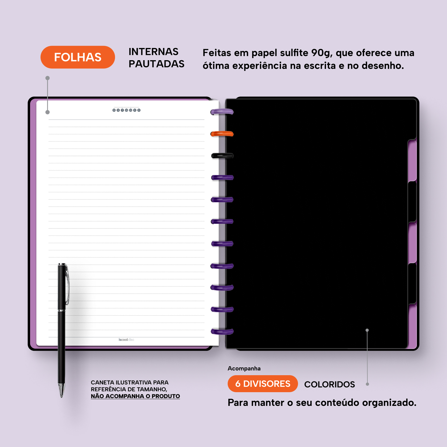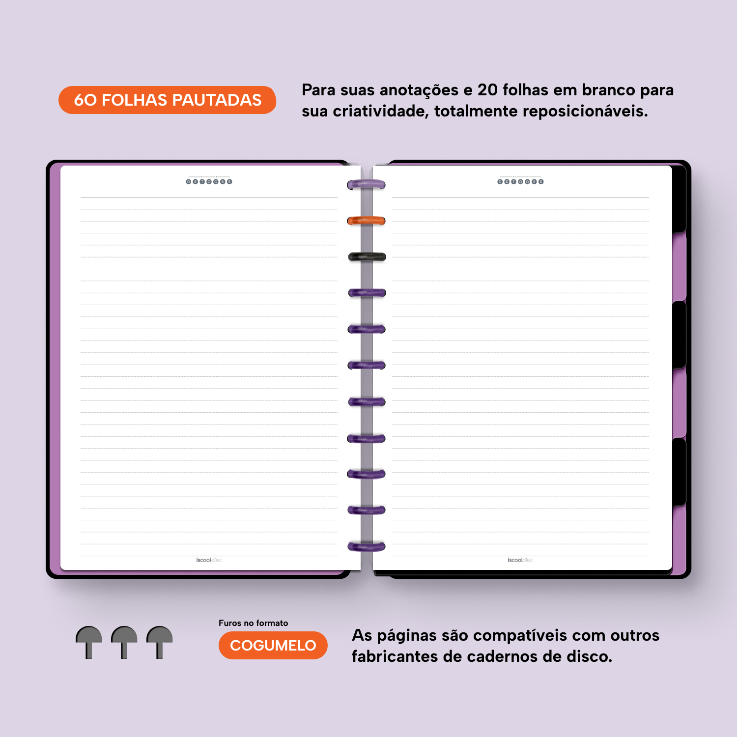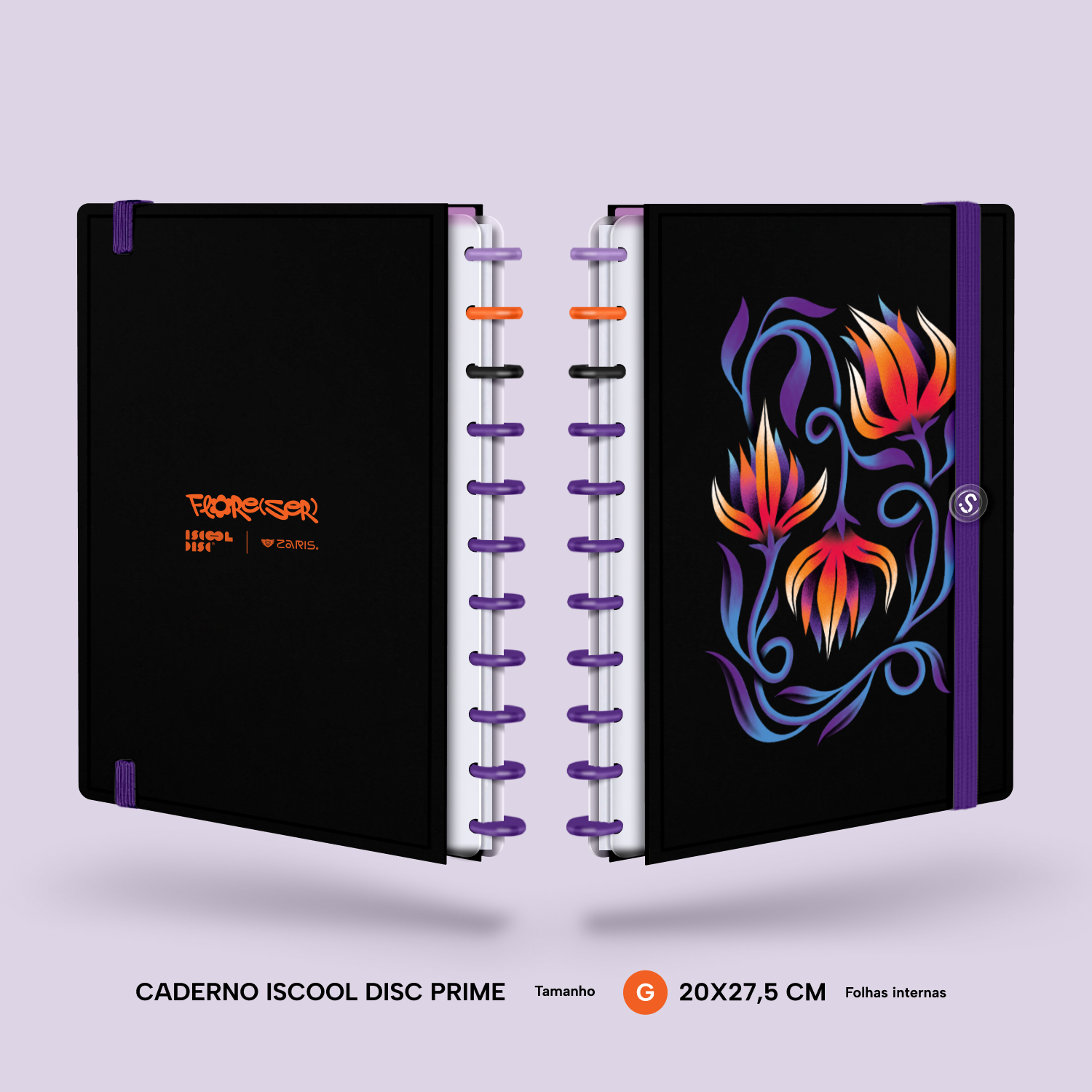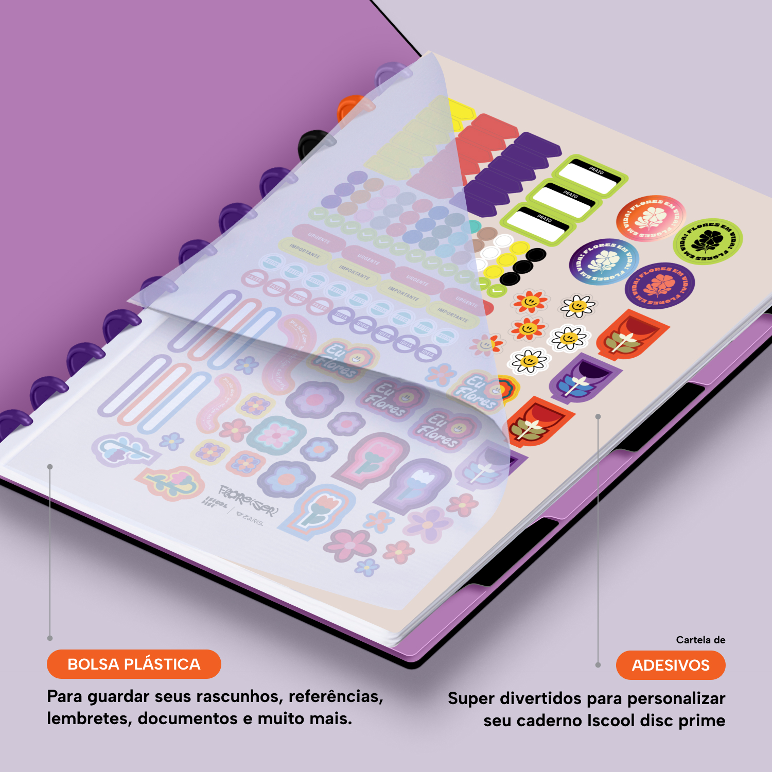 Além de tudo isso, o iscooldisc Prime conta com detalhes que fazem toda a diferença: elástico para fechamento da capa, muito mais estilo e privacidade para suas anotações; bolsa plástica para guardar seus rascunhos, referências, lembretes, documentos e uma cartela de adesivos incríveis, para que você possa personalizar seu caderno do seu jeitinho!