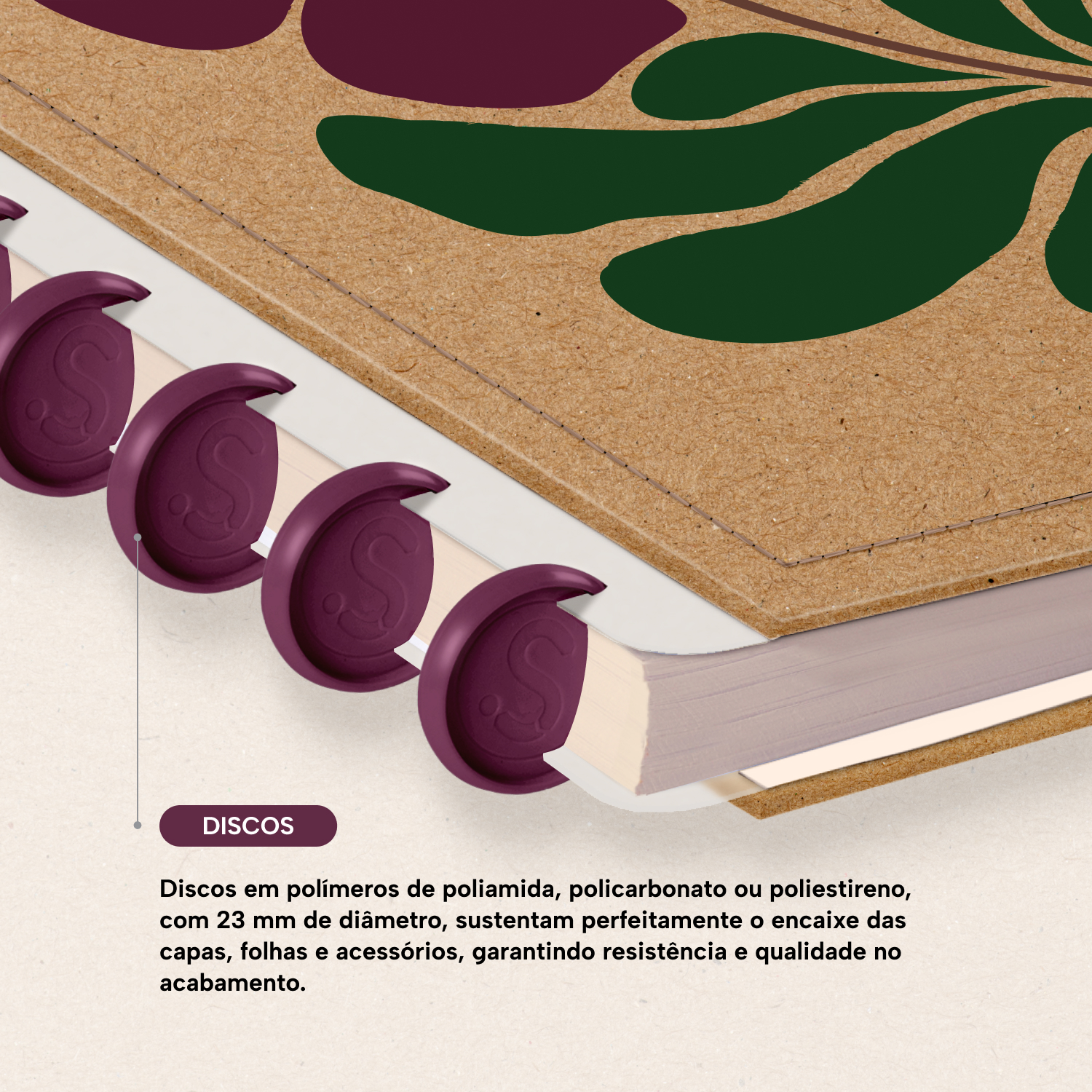 Encadernado com 11 discos M de 23mm em polímero de nylon e/ou policarbonato coloridos, fabricados no Brasil.