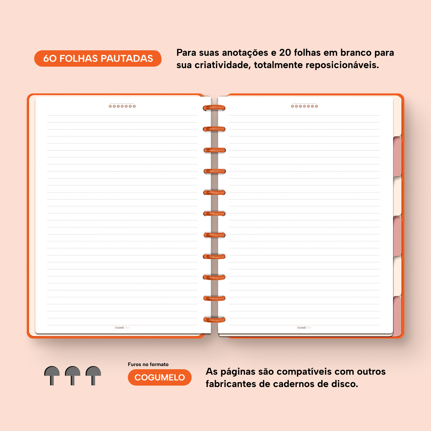 Com furos no formato de “cogumelo”, você poderá dar um “up” em seu caderno com nossos refis, além de ser compatível com outros fabricantes de cadernos de discos.