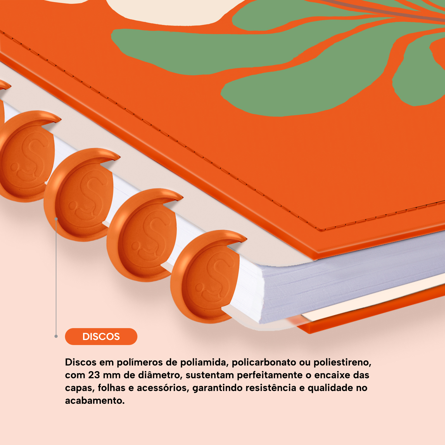 Encadernado com 11 discos M de 23mm em polímero de nylon e/ou policarbonato coloridos, fabricados no Brasil.