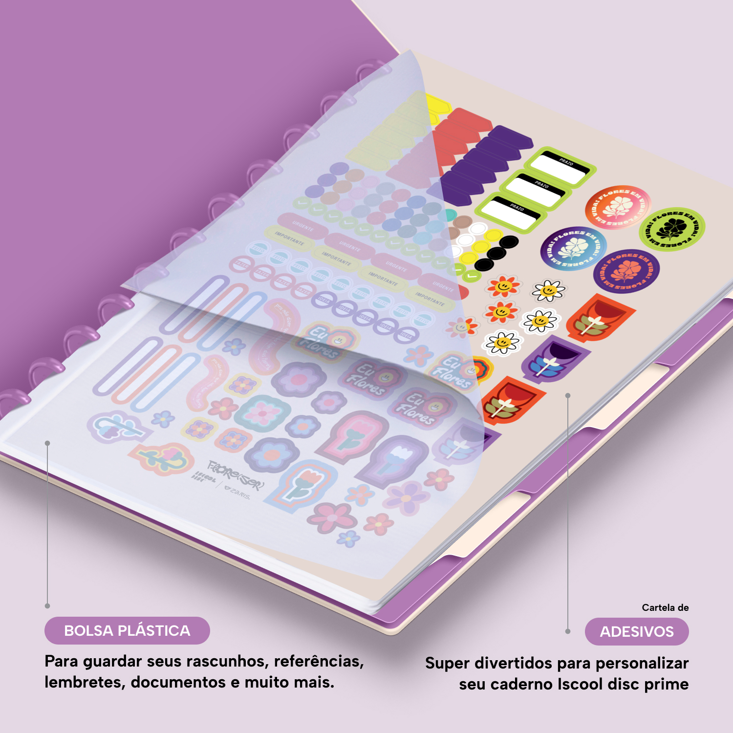 Além de tudo isso, o iscooldisc Prime conta com detalhes que fazem toda a diferença: elástico para fechamento da capa, muito mais estilo e privacidade para suas anotações; bolsa plástica para guardar seus rascunhos, referências, lembretes, documentos e uma cartela de adesivos incríveis, para que você possa personalizar seu caderno do seu jeitinho!