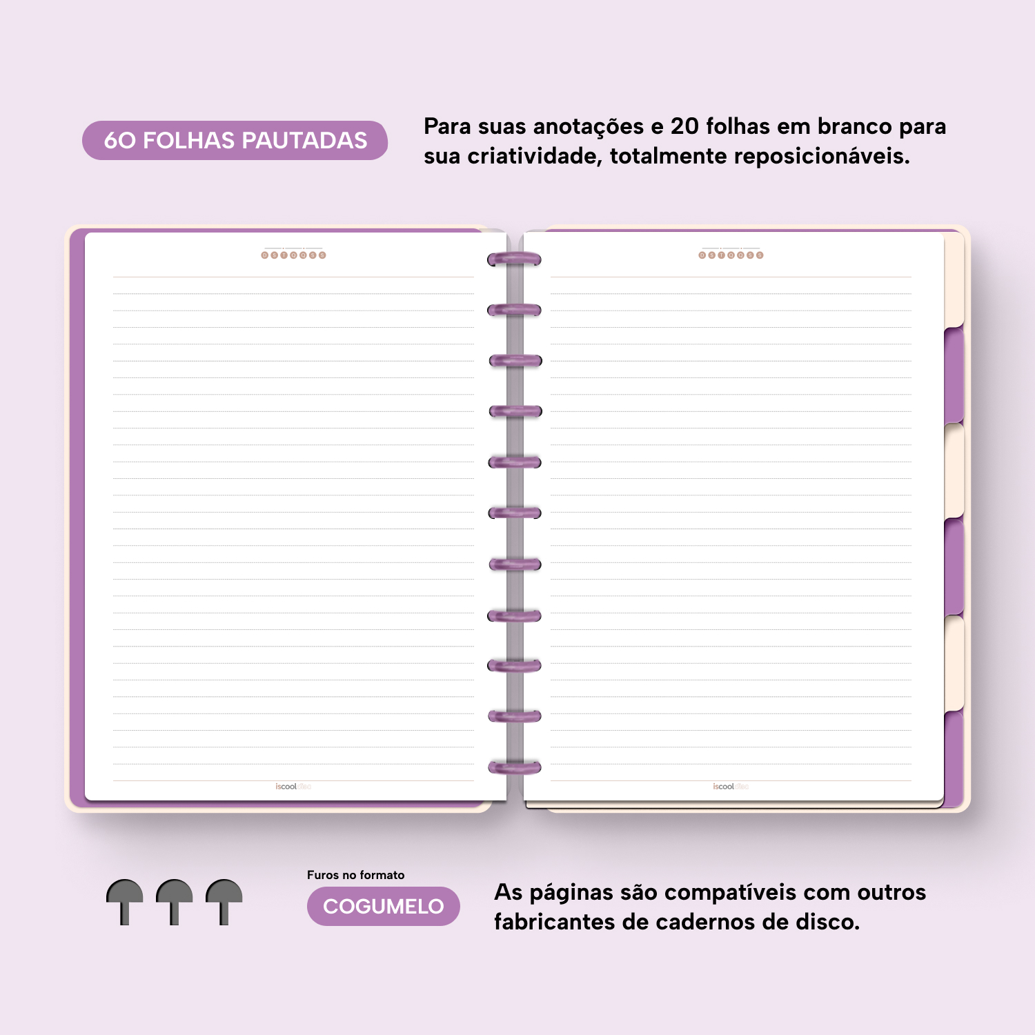 O miolo conta com 60 folhas pautadas decoradas em papel sulfite 90g (aquele papel mais “grossinho”) para que você use e abuse das suas canetas especiais, e 20 folhas em branco, ideais para explorar seu lado mais criativo ou até imprimir nelas.
