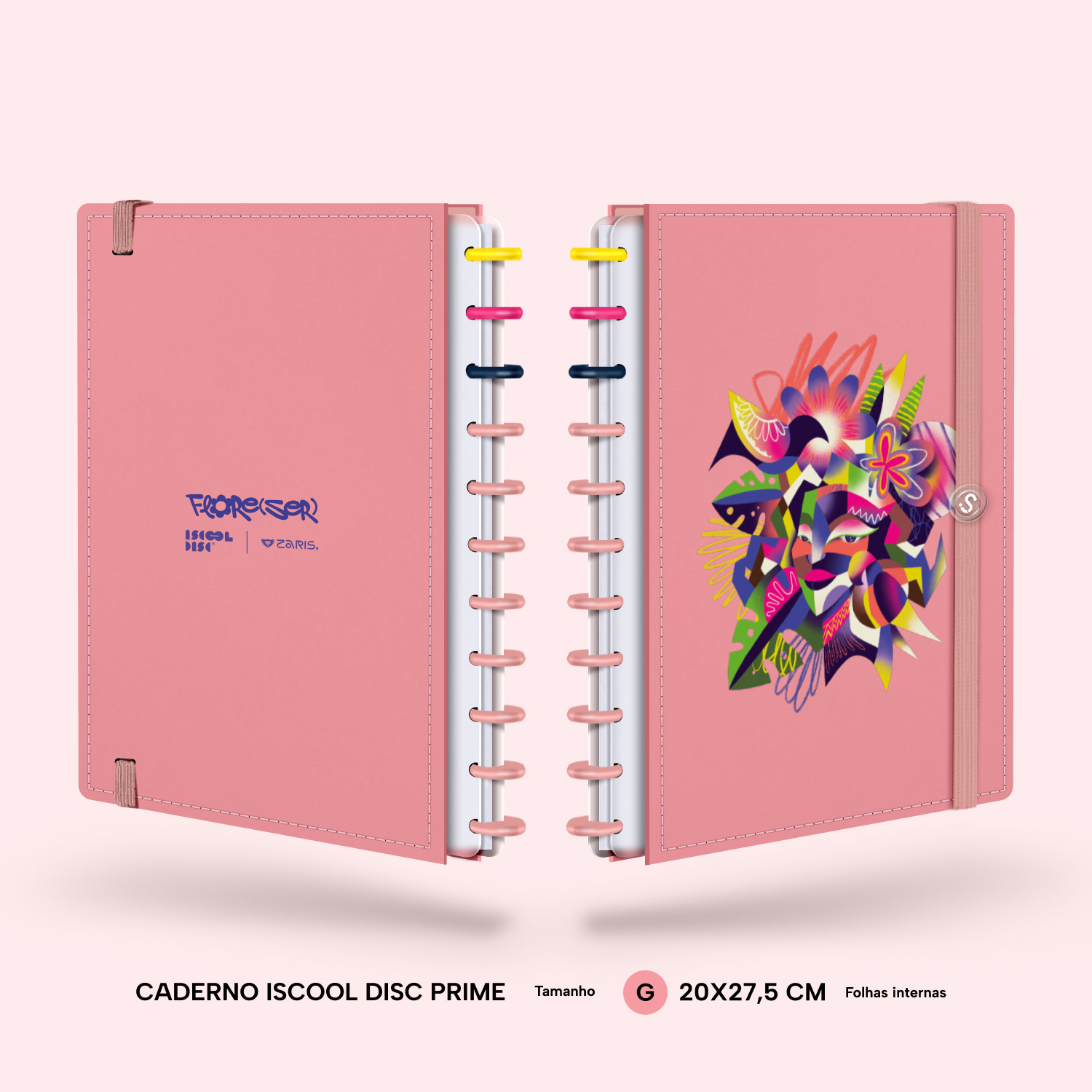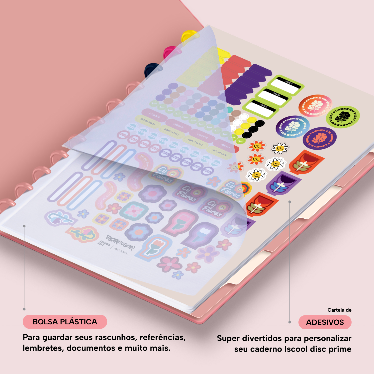 Além de tudo isso, o iscooldisc Prime conta com detalhes que fazem toda a diferença: elástico para fechamento da capa, muito mais estilo e privacidade para suas anotações; bolsa plástica para guardar seus rascunhos, referências, lembretes, documentos e uma cartela de adesivos incríveis, para que você possa personalizar seu caderno do seu jeitinho!