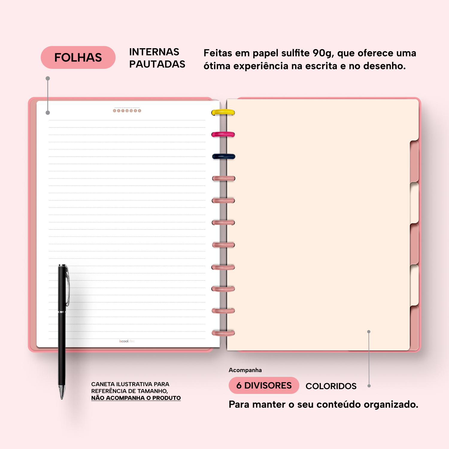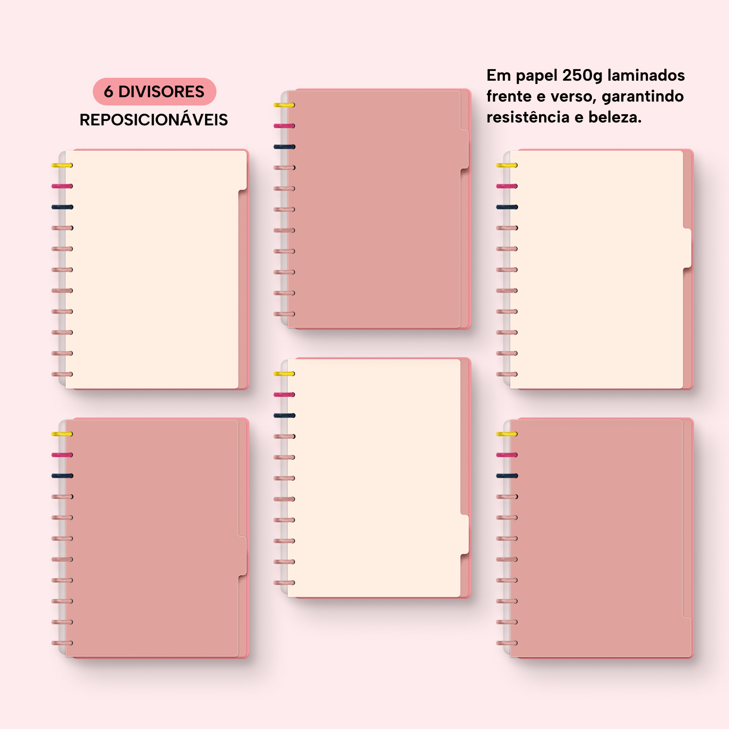 A capa é dura, com impressão digital de alta definição, e acompanha 6 lindas divisórias que você pode colocar em qualquer local do caderno, funcionando como o guia perfeito para sua organização.