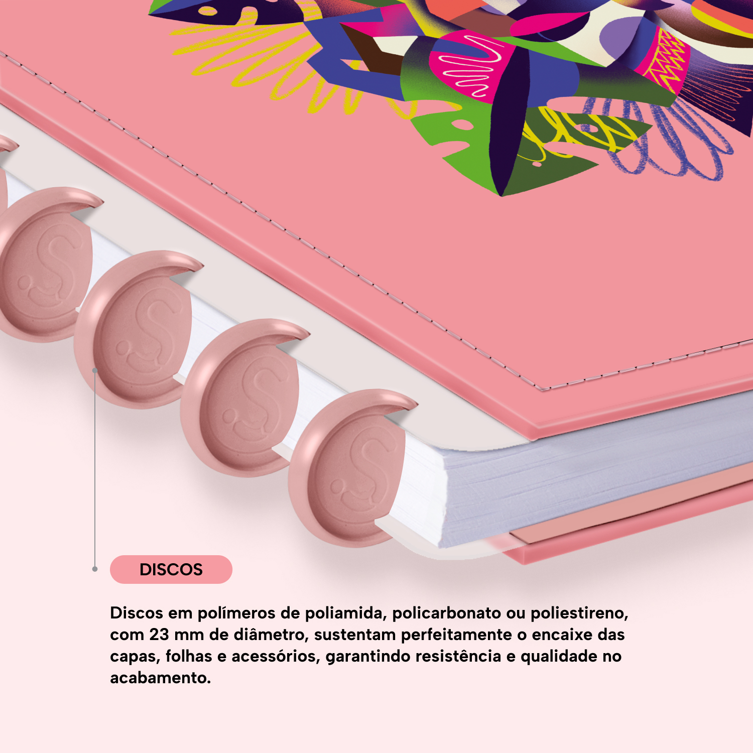 Encadernado com 11 discos M de 23mm em polímero de nylon e/ou policarbonato coloridos, fabricados no Brasil.