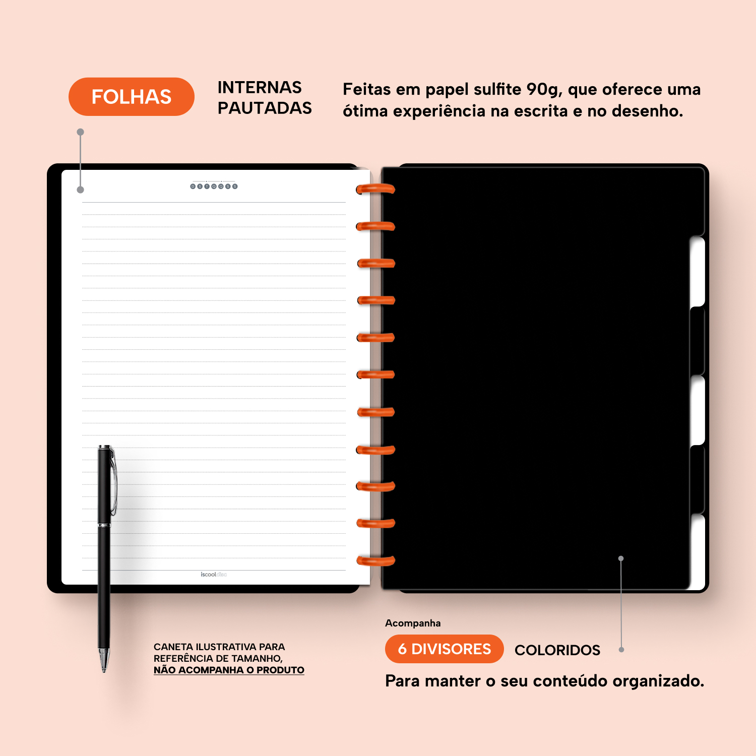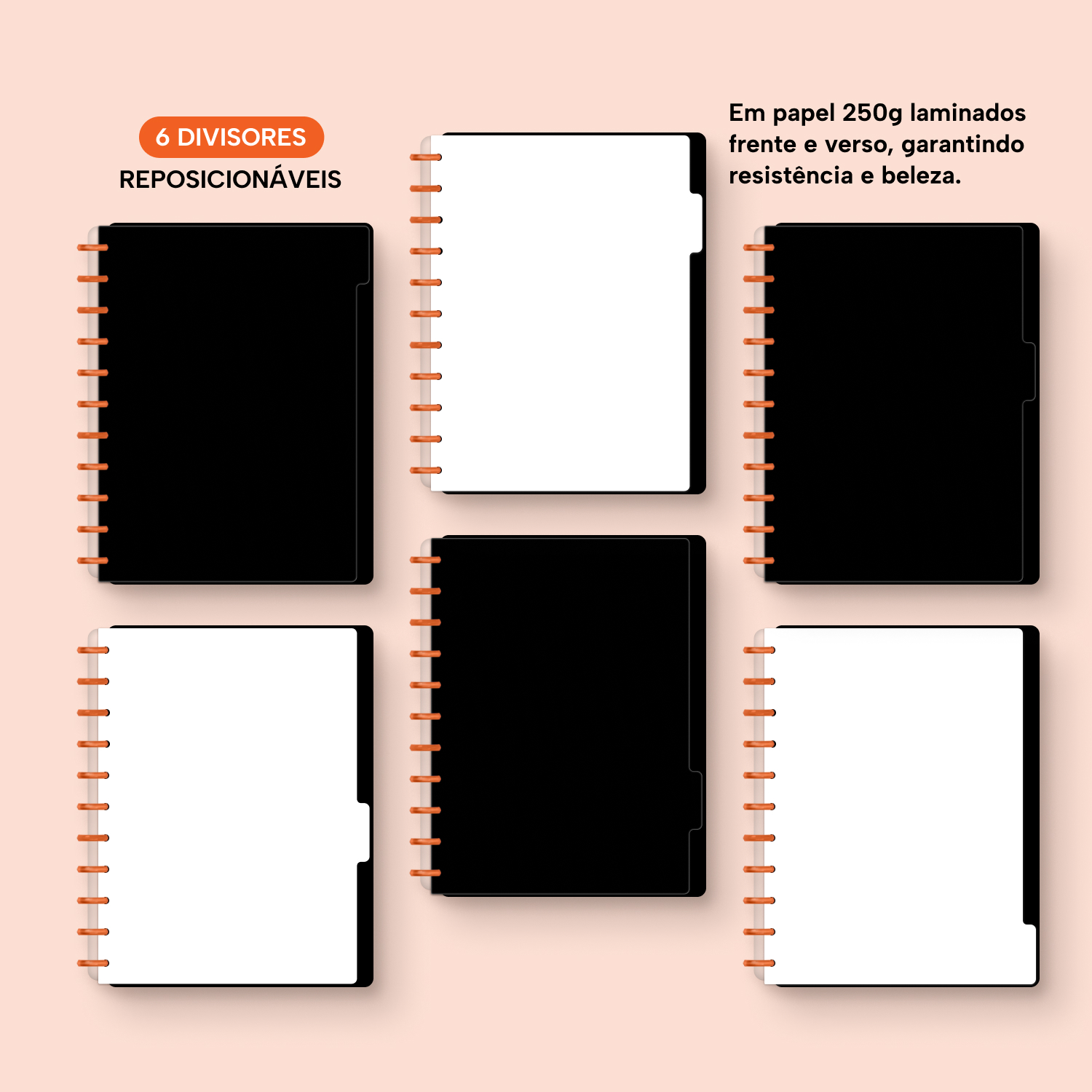 A capa é dura, com impressão digital de alta definição, e acompanha 6 lindas divisórias que você pode colocar em qualquer local do caderno, funcionando como o guia perfeito para sua organização.