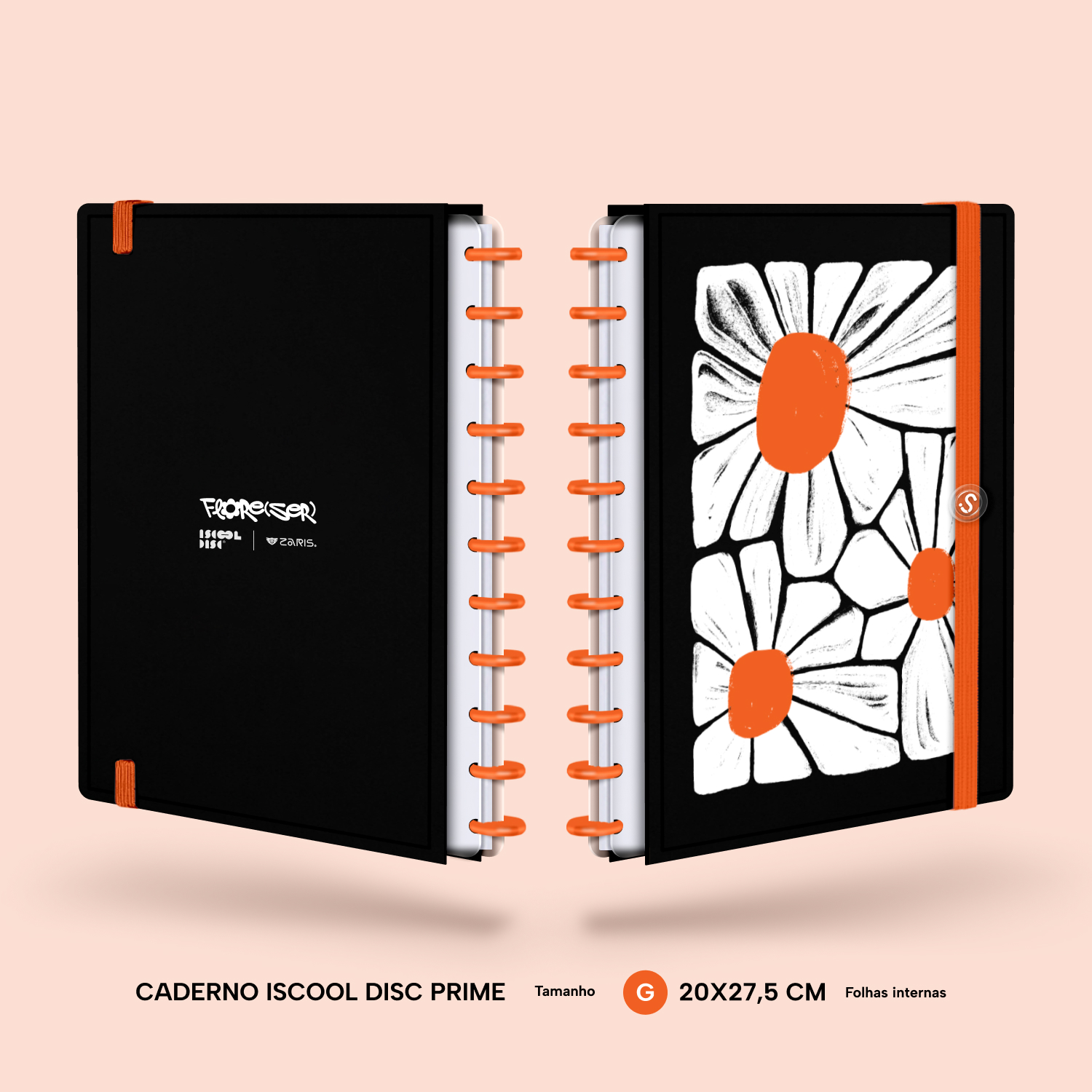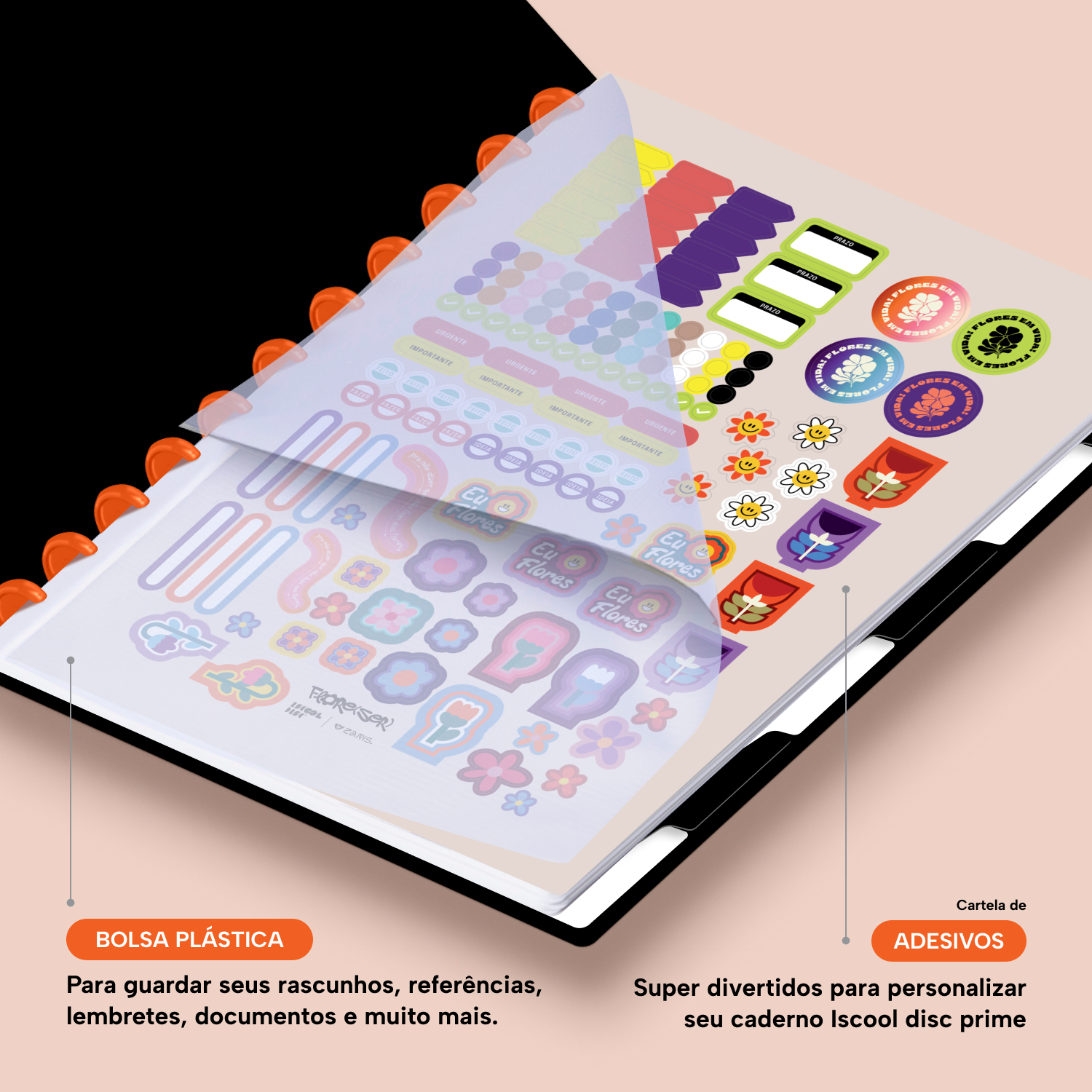 Além de tudo isso, o iscooldisc Prime conta com detalhes que fazem toda a diferença: elástico para fechamento da capa, muito mais estilo e privacidade para suas anotações; bolsa plástica para guardar seus rascunhos, referências, lembretes, documentos e uma cartela de adesivos incríveis, para que você possa personalizar seu caderno do seu jeitinho!