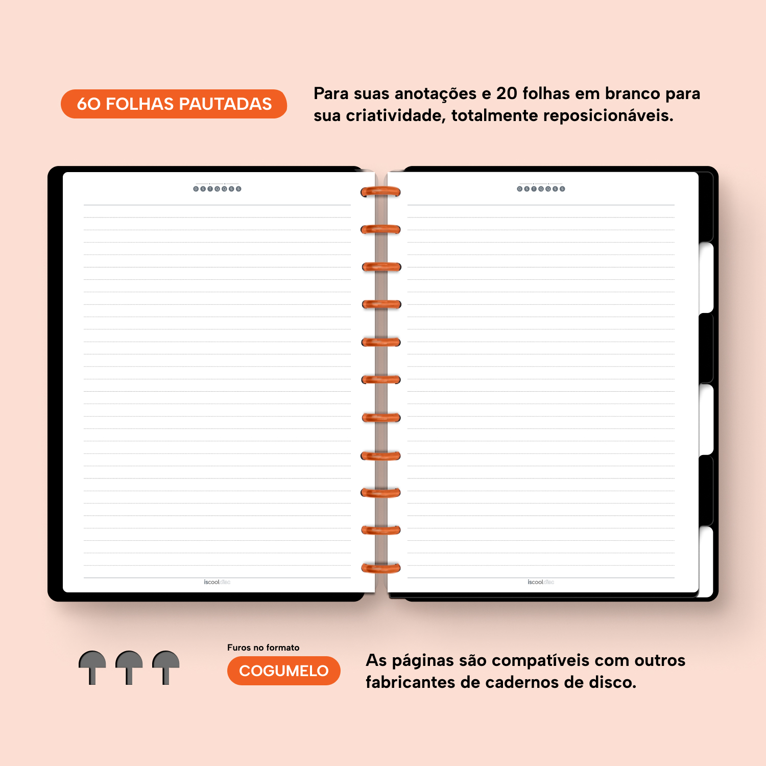 Com furos no formato de “cogumelo”, você poderá dar um “up” em seu caderno com nossos refis, além de ser compatível com outros fabricantes de cadernos de discos.