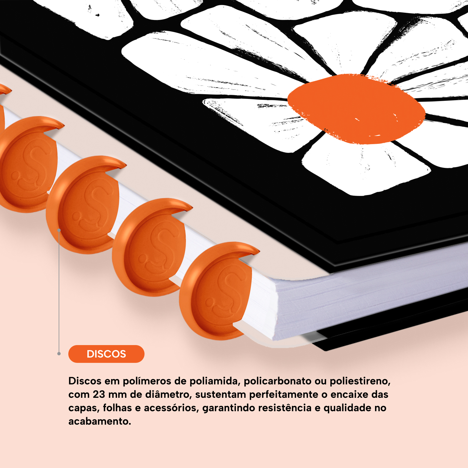 Encadernado com 11 discos M de 23mm em polímero de nylon e/ou policarbonato coloridos, fabricados no Brasil.