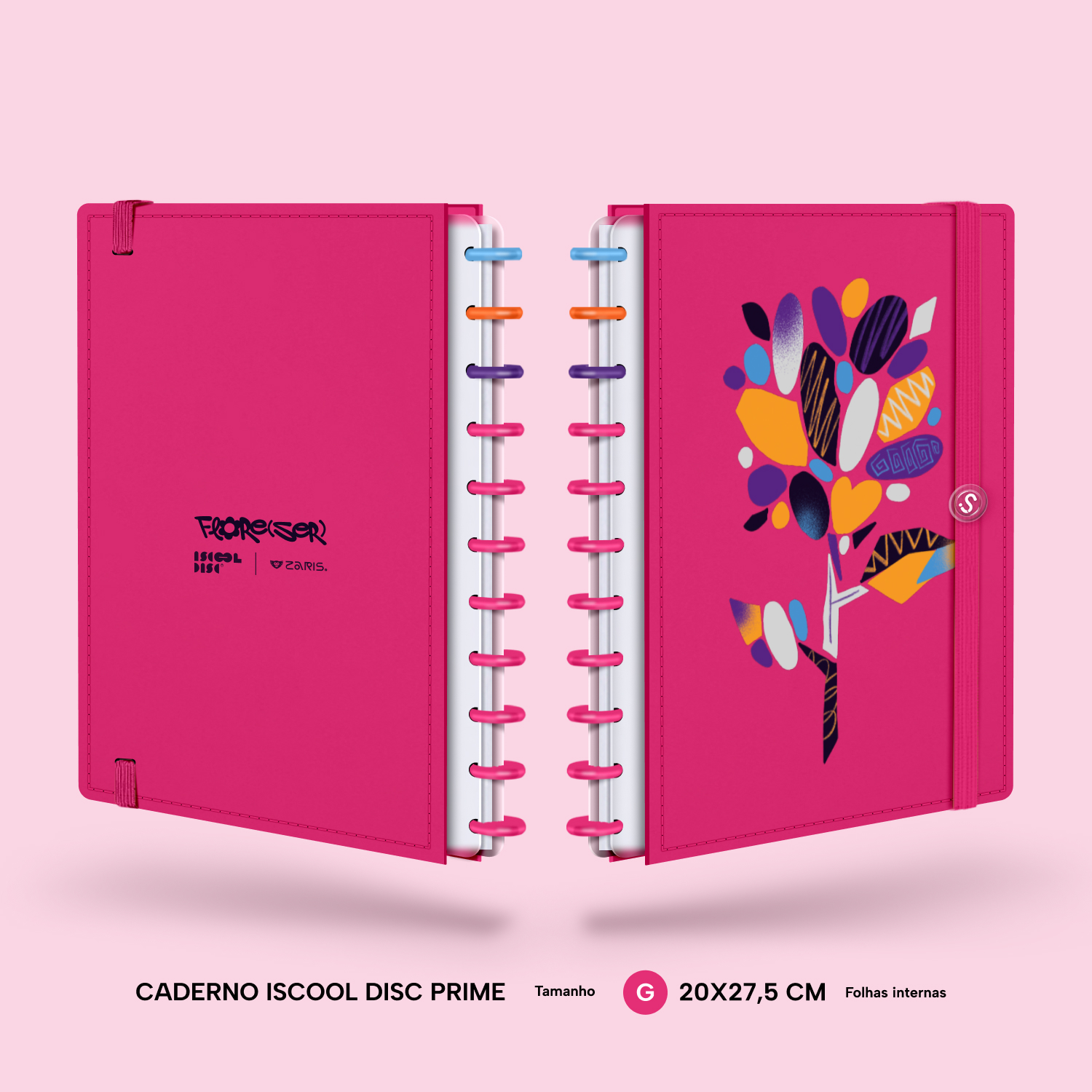 Além de tudo isso, o iscooldisc Prime conta com detalhes que fazem toda a diferença: elástico para fechamento da capa, muito mais estilo e privacidade para suas anotações; bolsa plástica para guardar seus rascunhos, referências, lembretes, documentos e uma cartela de adesivos incríveis, para que você possa personalizar seu caderno do seu jeitinho!