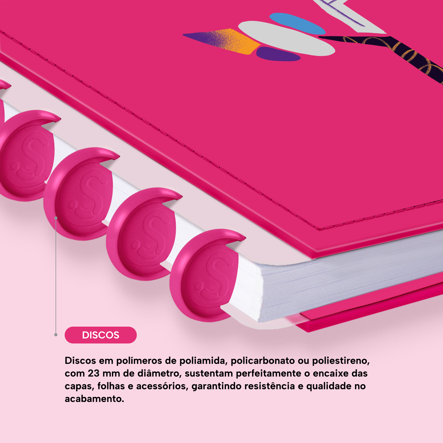 Encadernado com 11 discos M de 23mm em polímero de nylon e/ou policarbonato coloridos, fabricados no Brasil.
