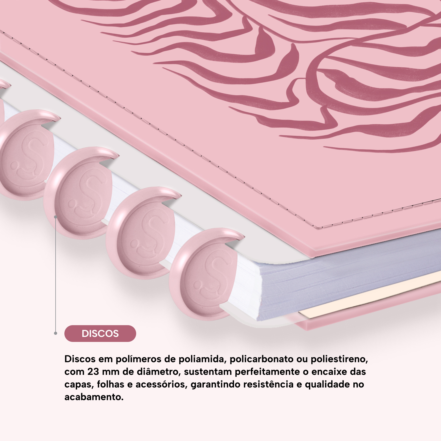 Encadernado com 11 discos M de 23mm em polímero de nylon e/ou policarbonato coloridos, fabricados no Brasil.