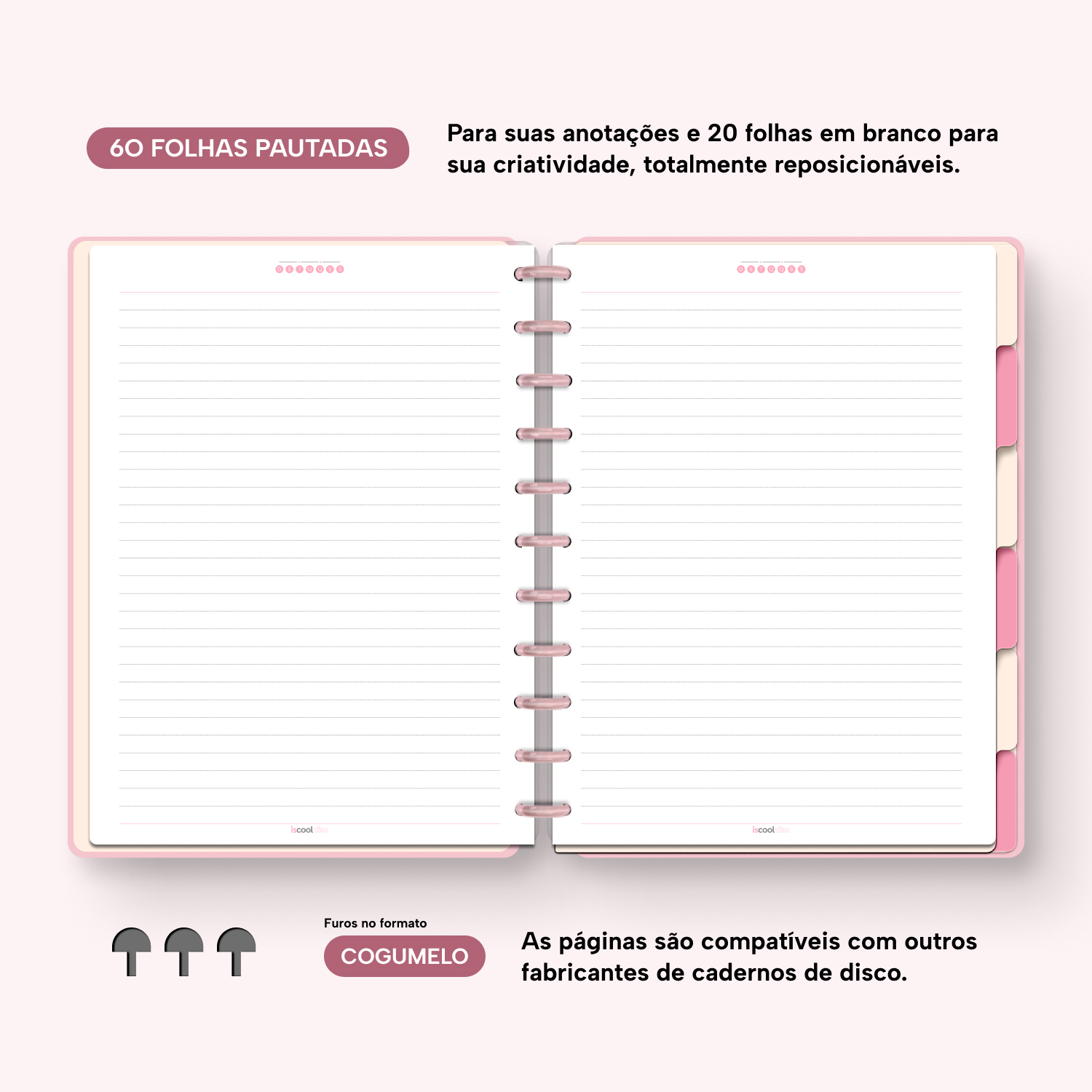 O miolo conta com 60 folhas pautadas decoradas em papel sulfite 90g (aquele papel mais “grossinho”) para que você use e abuse das suas canetas especiais, e 20 folhas em branco, ideais para explorar seu lado mais criativo ou até imprimir nelas.