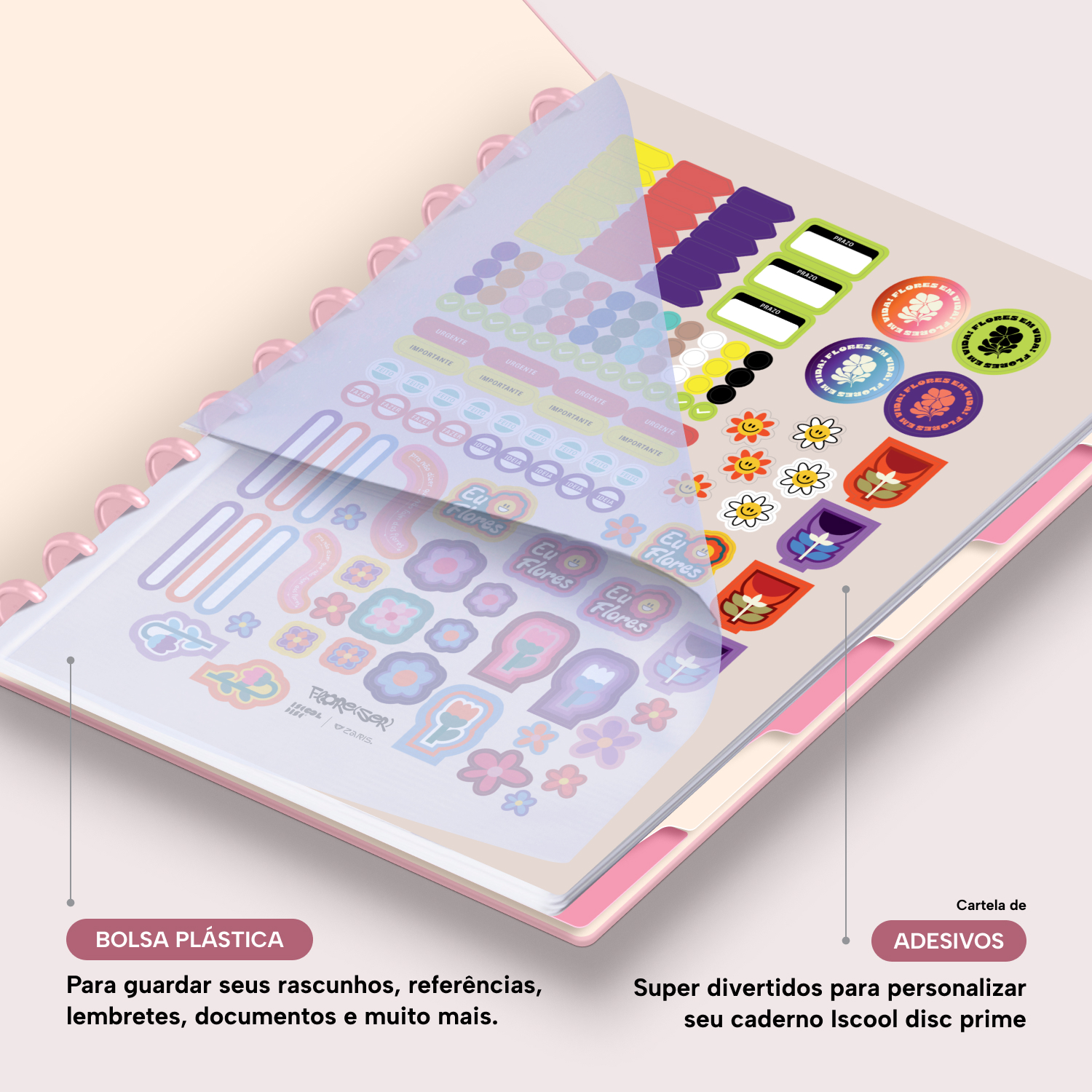 Além de tudo isso, o iscooldisc Prime conta com detalhes que fazem toda a diferença: elástico para fechamento da capa, muito mais estilo e privacidade para suas anotações; bolsa plástica para guardar seus rascunhos, referências, lembretes, documentos e uma cartela de adesivos incríveis, para que você possa personalizar seu caderno do seu jeitinho!