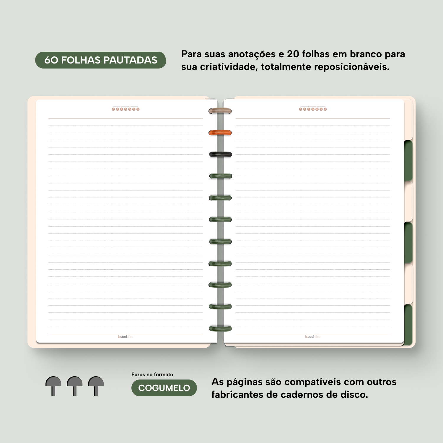 Com furos no formato de “cogumelo”, você poderá dar um “up” em seu caderno com nossos refis, além de ser compatível com outros fabricantes de cadernos de discos.