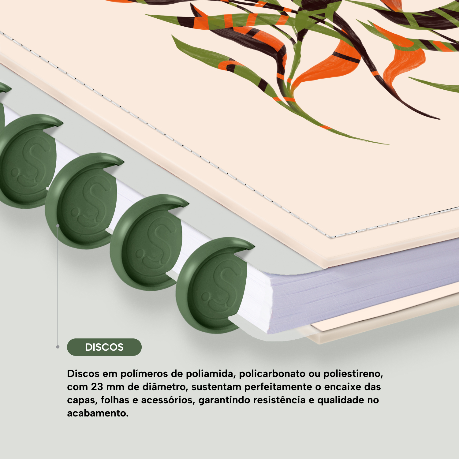 Os nossos discos são fabricados em polímero de nylon e/ou policarbonato. Podem ser substituídos, proporcionando imensa variedade na combinação das cores, qualidade no acabamento e eficácia no encaixe das capas, folhas e acessórios.