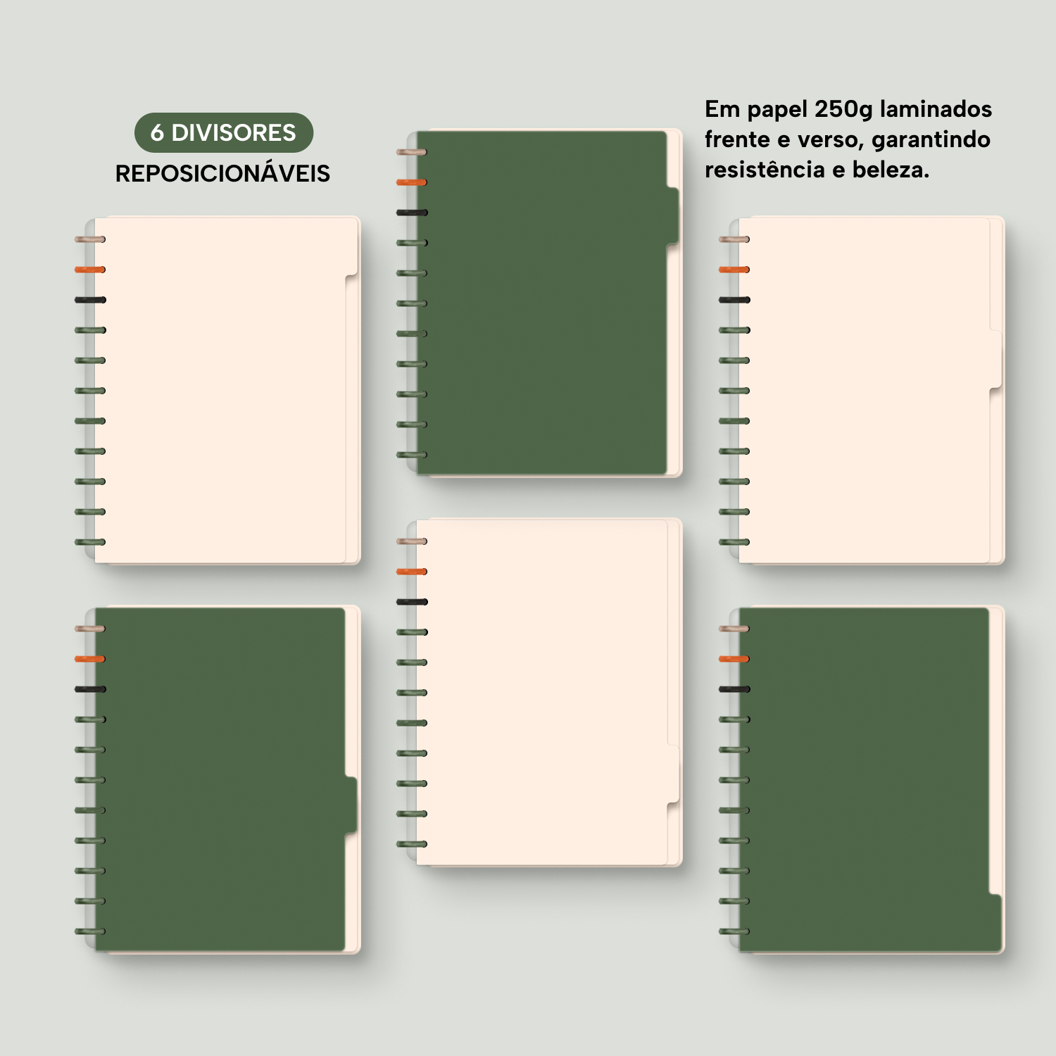 6 divisores laminados (frente e verso) em papel 250g.