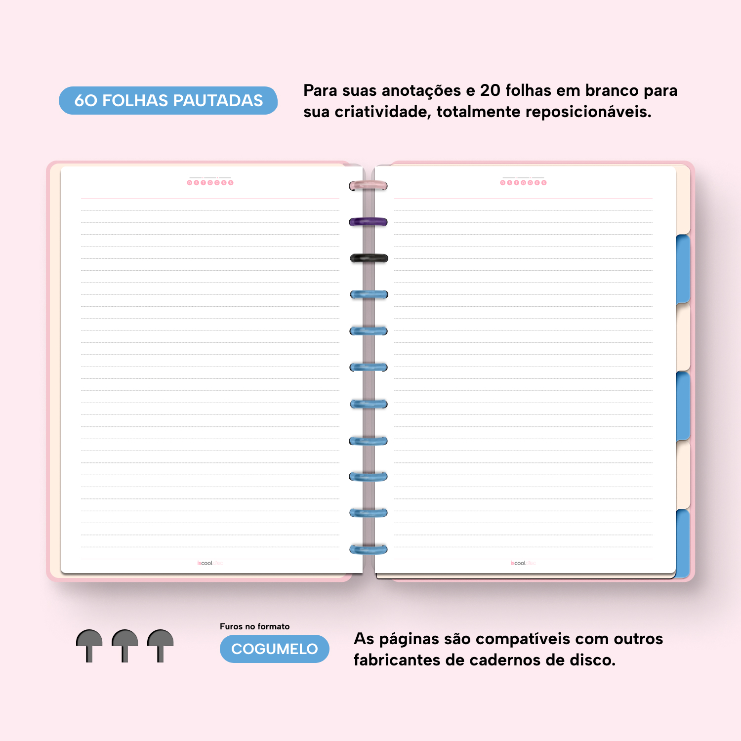 O miolo conta com 60 folhas pautadas decoradas em papel sulfite 90g (aquele papel mais “grossinho”) para que você use e abuse das suas canetas especiais, e 20 folhas em branco, ideais para explorar seu lado mais criativo ou até imprimir nelas.