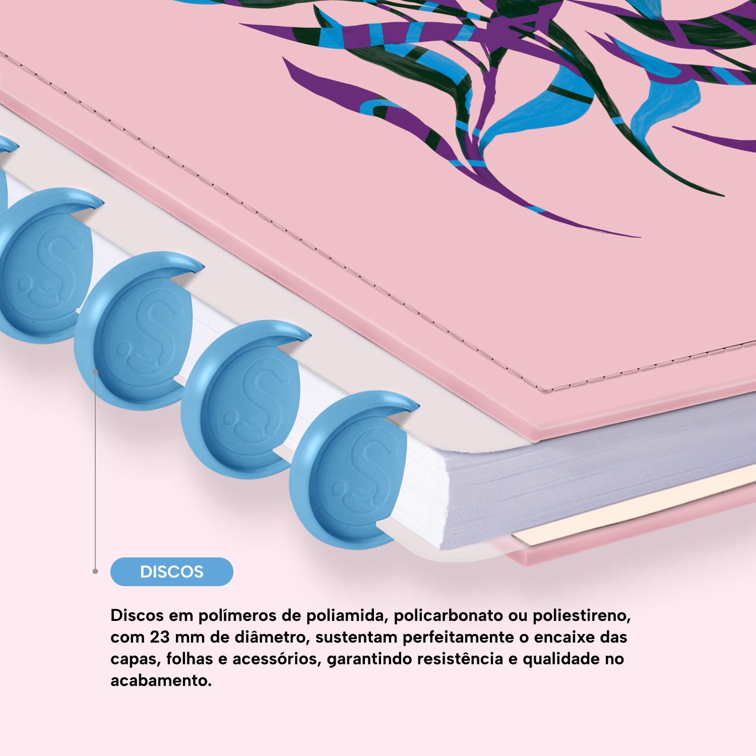 Encadernado com 11 discos M de 23mm em polímero de nylon e/ou policarbonato coloridos, fabricados no Brasil.