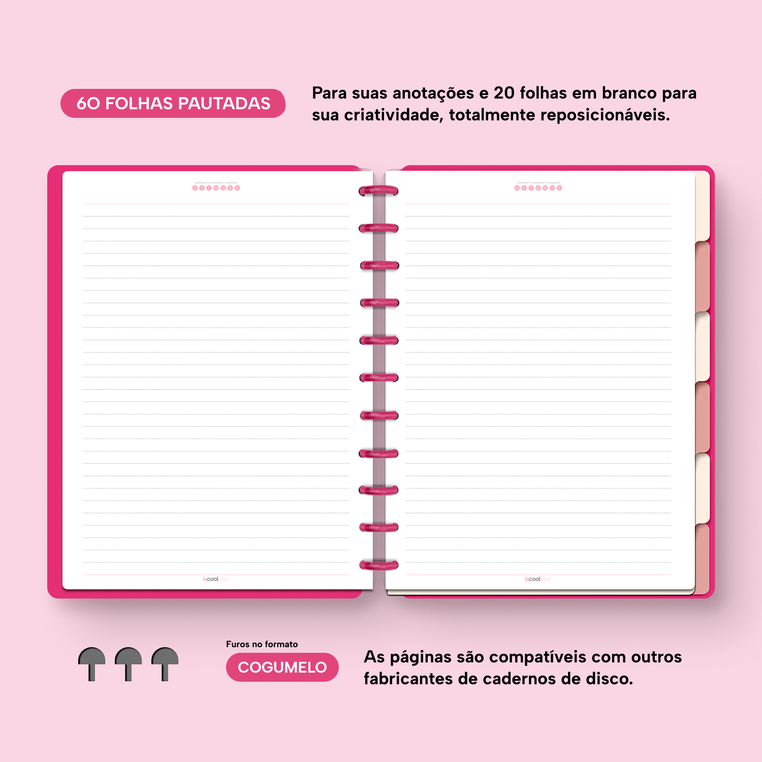 Com furos no formato de “cogumelo”, você poderá dar um “up” em seu caderno com nossos refis, além de ser compatível com outros fabricantes de cadernos de discos.
