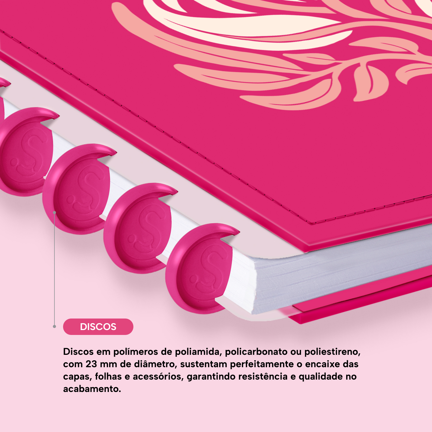 Encadernado com 11 discos M de 23mm em polímero de nylon e/ou policarbonato coloridos, fabricados no Brasil.