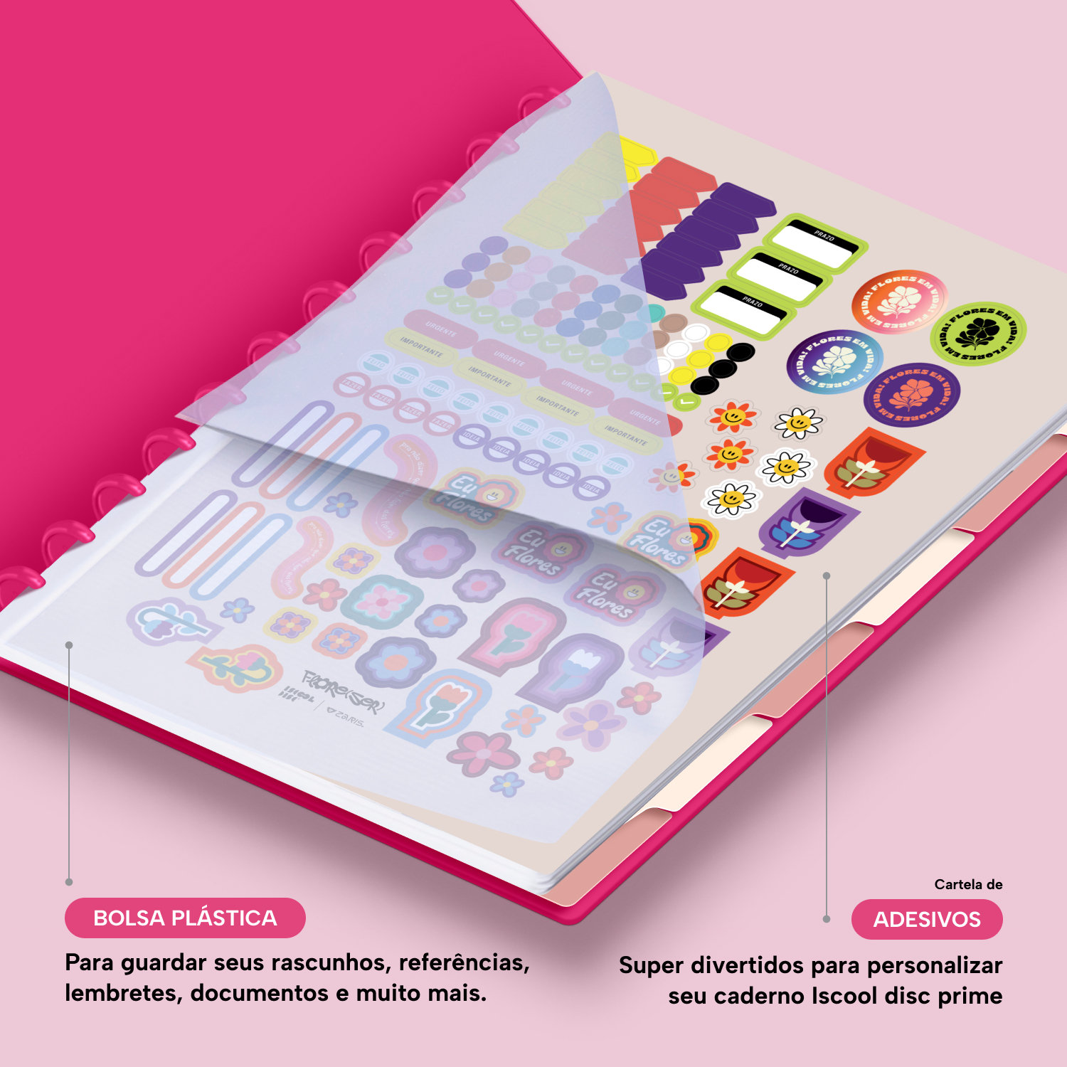 Além de tudo isso, o iscooldisc Prime conta com detalhes que fazem toda a diferença: elástico para fechamento da capa, muito mais estilo e privacidade para suas anotações; bolsa plástica para guardar seus rascunhos, referências, lembretes, documentos e uma cartela de adesivos incríveis, para que você possa personalizar seu caderno do seu jeitinho!