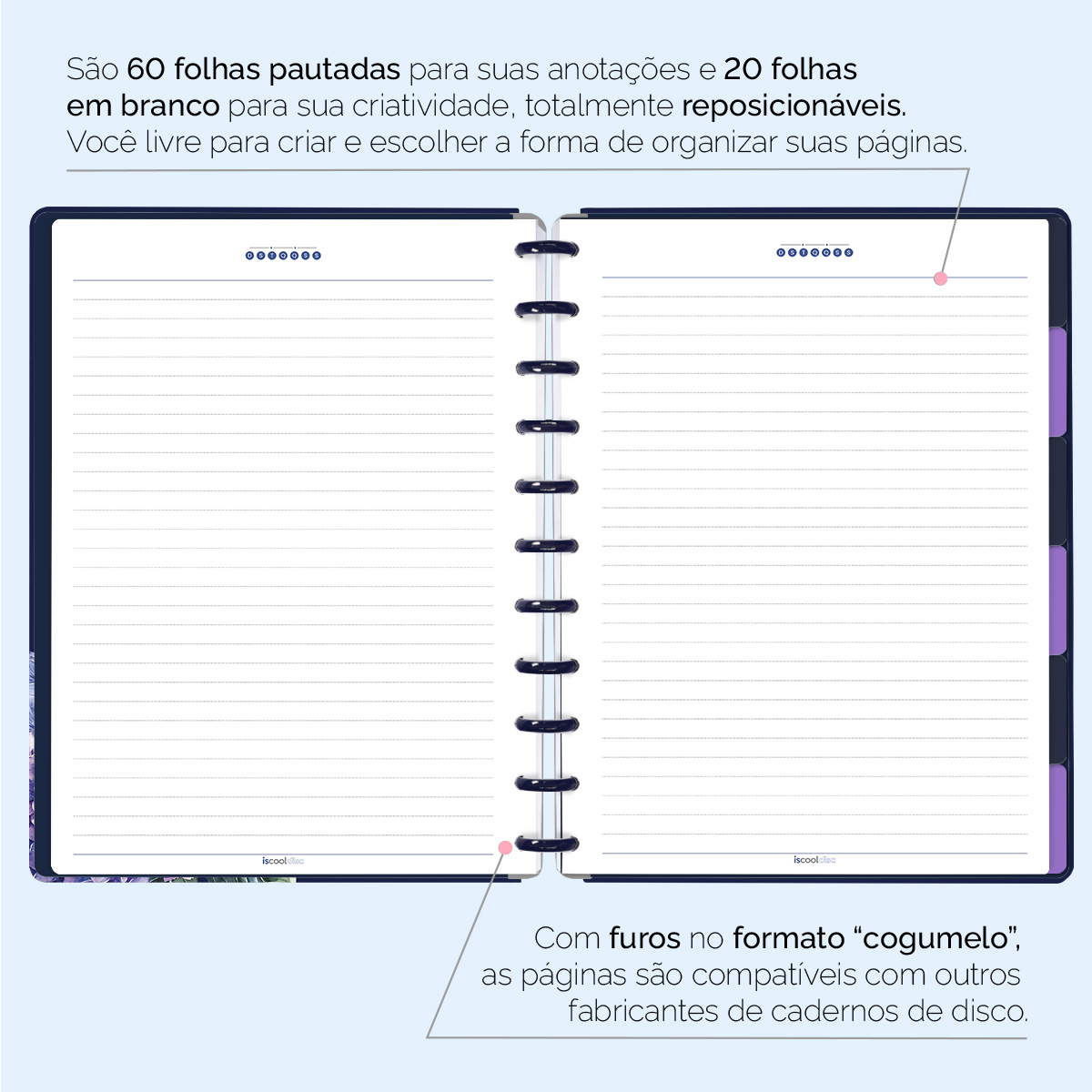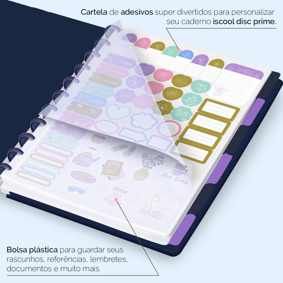 Além de tudo isso, o ISCOOL DISC PRIME UNIVERSITÁRIO, conta com detalhezinhos que fazem toda diferença: elástico para fechamento da capa, muito mais estilo e privacidade para suas anotações; bolsa plástica para guardar seus rascunhos, referências, lembretes, documentos e uma cartela de adesivos incríveis, para que você possa personalizar seu caderno do seu jeitinho!