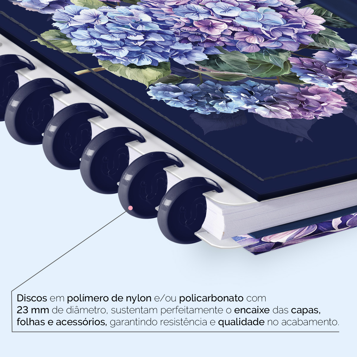 Os nossos discos são fabricados em polímero de nylon e/ou policarbonato, podem ser substituídos, proporcionando imensa variedade na combinação das cores, qualidade no acabamento e eficácia no encaixe das capas, folhas e acessórios.