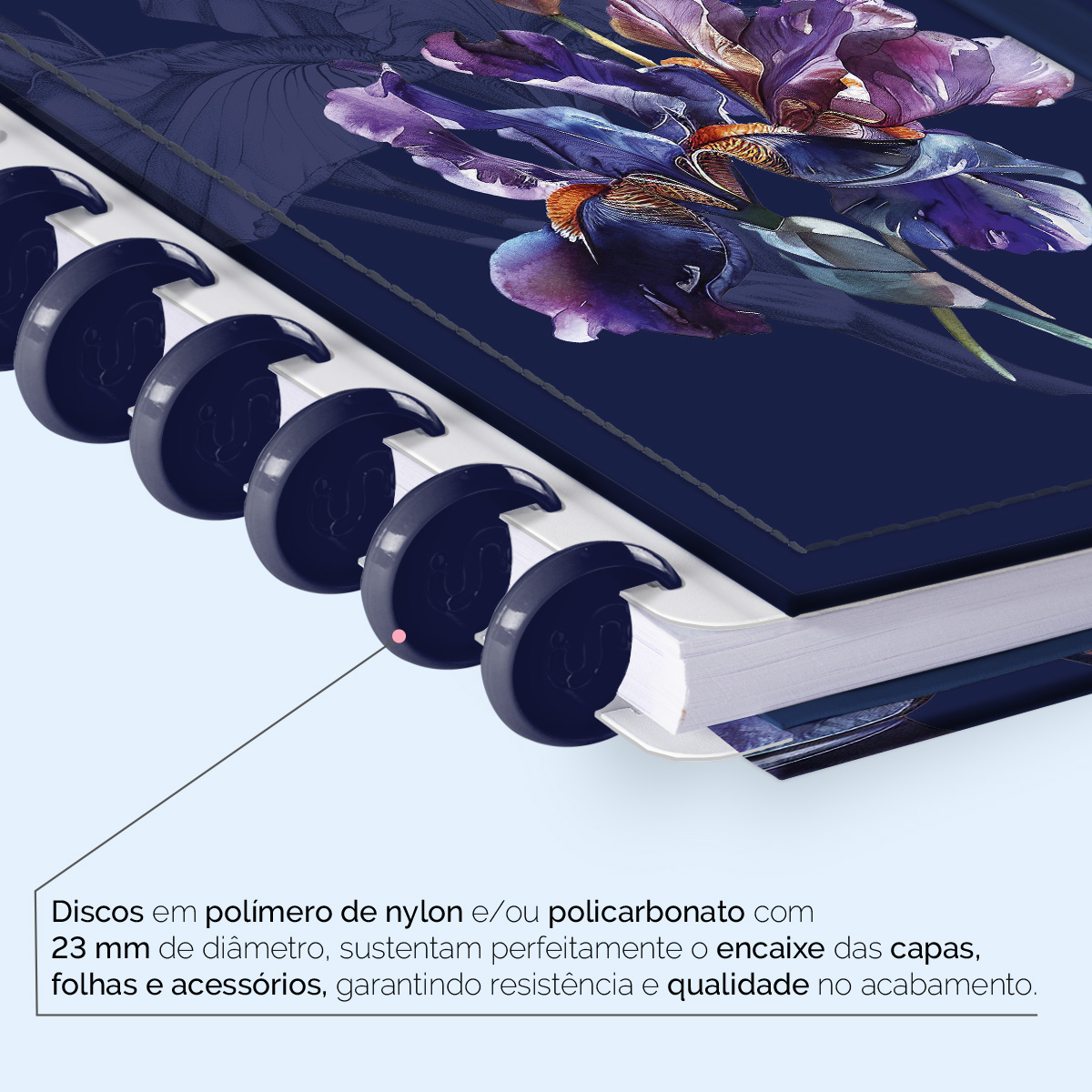 Encadernado com 11 discos M de 23mm em polímero de nylon e/ou policarbonato, fabricados no Brasil.