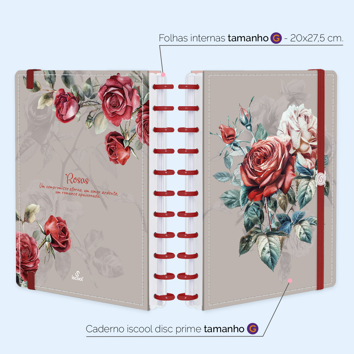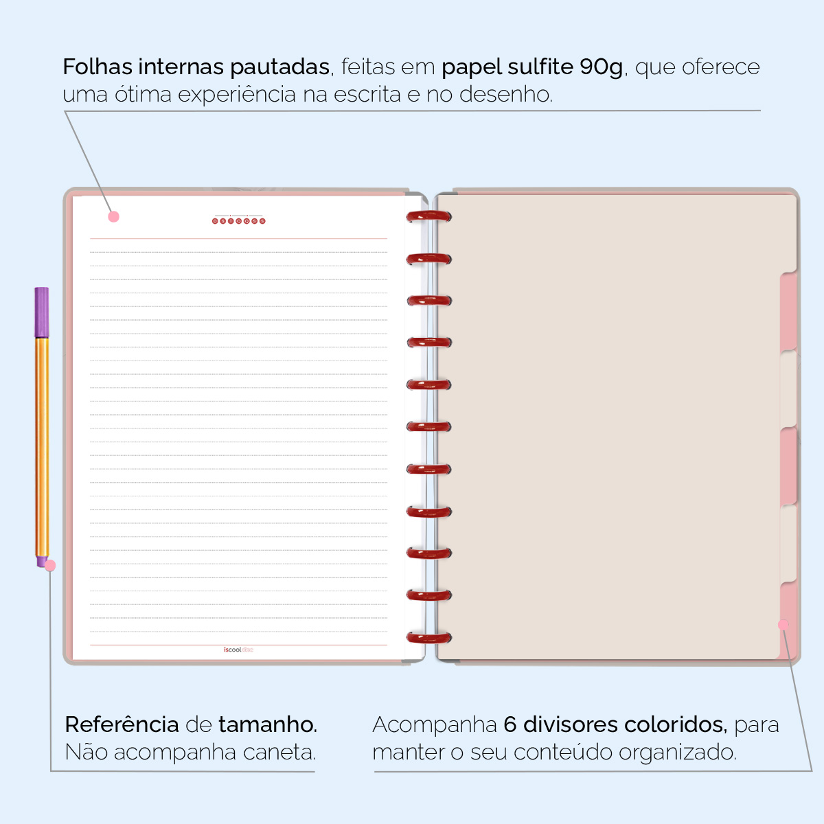 Além de tudo isso, o ISCOOL DISC PRIME UNIVERSITÁRIO, conta com detalhezinhos que fazem toda diferença: elástico para fechamento da capa, muito mais estilo e privacidade para suas anotações; bolsa plástica para guardar seus rascunhos, referências, lembretes, documentos e uma cartela de adesivos incríveis, para que você possa personalizar seu caderno do seu jeitinho!