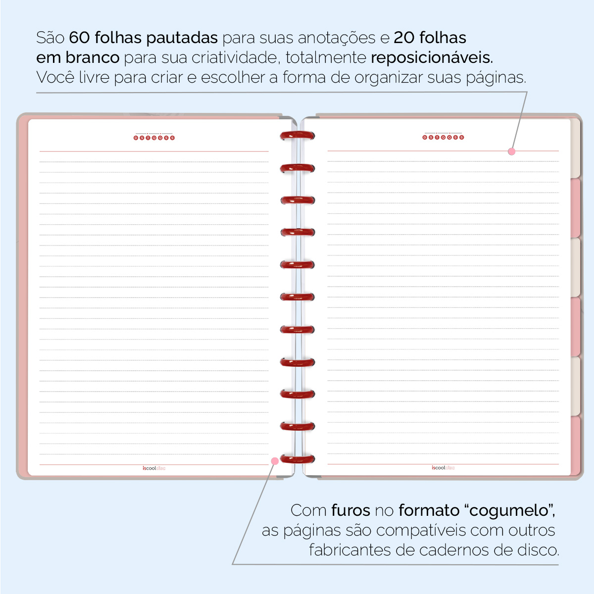 Com furos no formato de “cogumelo”, você poderá dar um “up” em seu caderno com nossos refis, além de ser compatível com outros fabricantes de cadernos de discos.