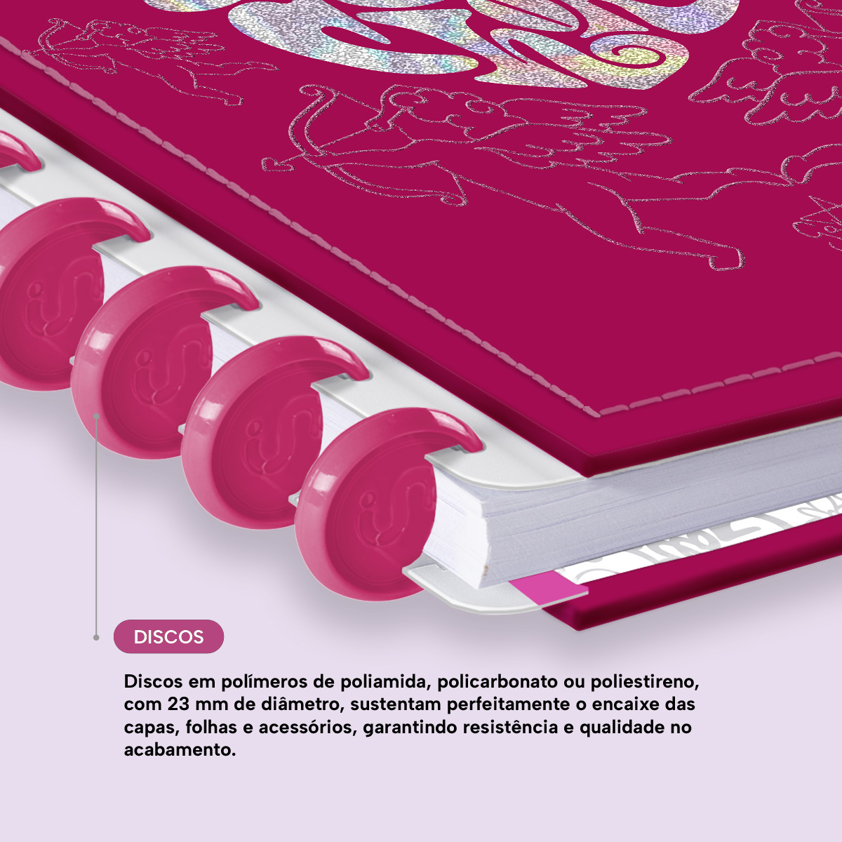 Encadernado com 9 ou 11 discos de 23mm ou 32mm em polímero de nylon e/ou policarbonato coloridos, fabricados no Brasil.