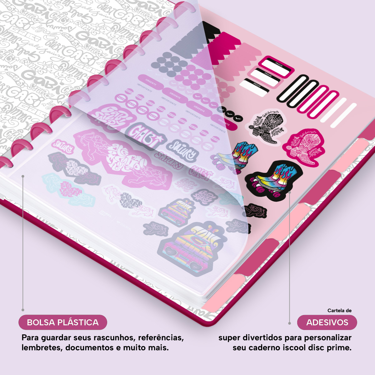 Além de tudo isso, o Iscool Disc Prime conta com detalhes que fazem toda a diferença: elástico para fechamento da capa — muito mais estilo e privacidade para suas anotações —, bolsa plástica para guardar seus rascunhos, referências, lembretes, documentos, e uma cartela de adesivos incríveis, para que você possa personalizar seu caderno do seu jeitinho!
